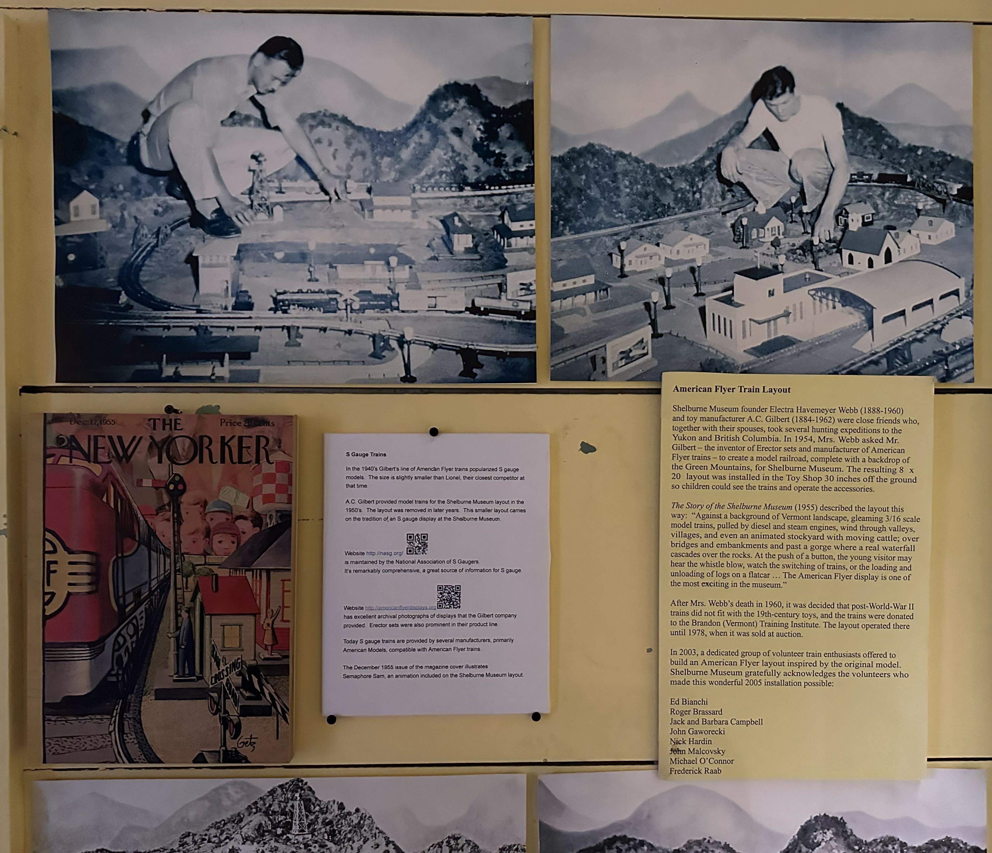 The museum's founder, Electra Webb, and A.C. Gilbert were close friends. In 1954 Mrs. Webb asked Mr. Gilbert to create a train layout for the museum. After Mrs. Webb passed away in 1960, the museum donated that layout to the Brandon Training Institute. There it was displayed until 1978 when it was sold at auction. A group of local S enthusiasts volunteered to build a new layout in 2003.