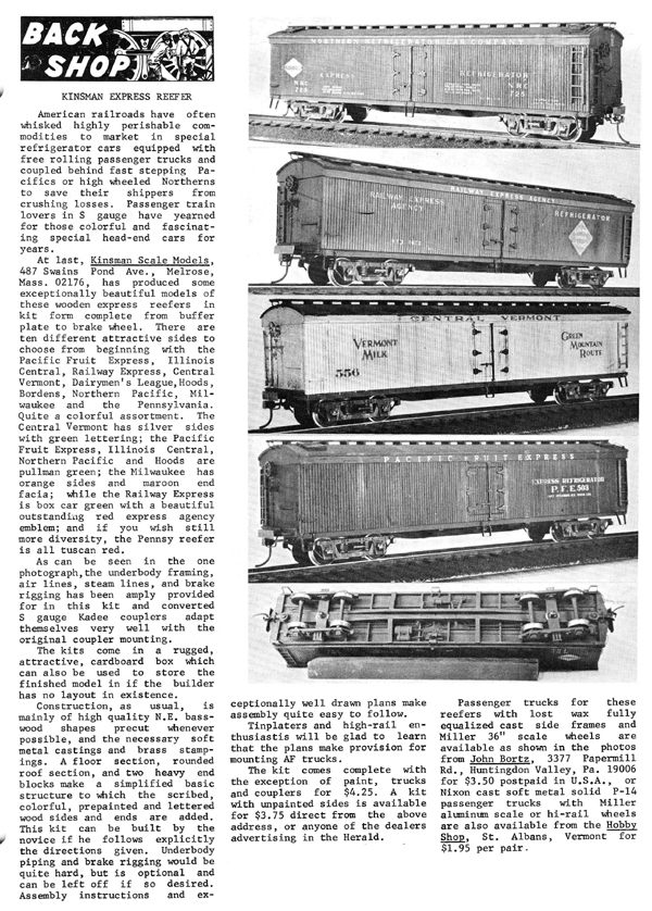The Kinsman reefer kits did not include trucks nor couplers. Kinsman did have trucks available separately, but they eventually discontinued them. After that, John Bortz, under the name Delaware Valley Kits, manufactured and sold the trucks for these cars. Scenery Unlimited eventually re-released some of these kits in the late-1970s.