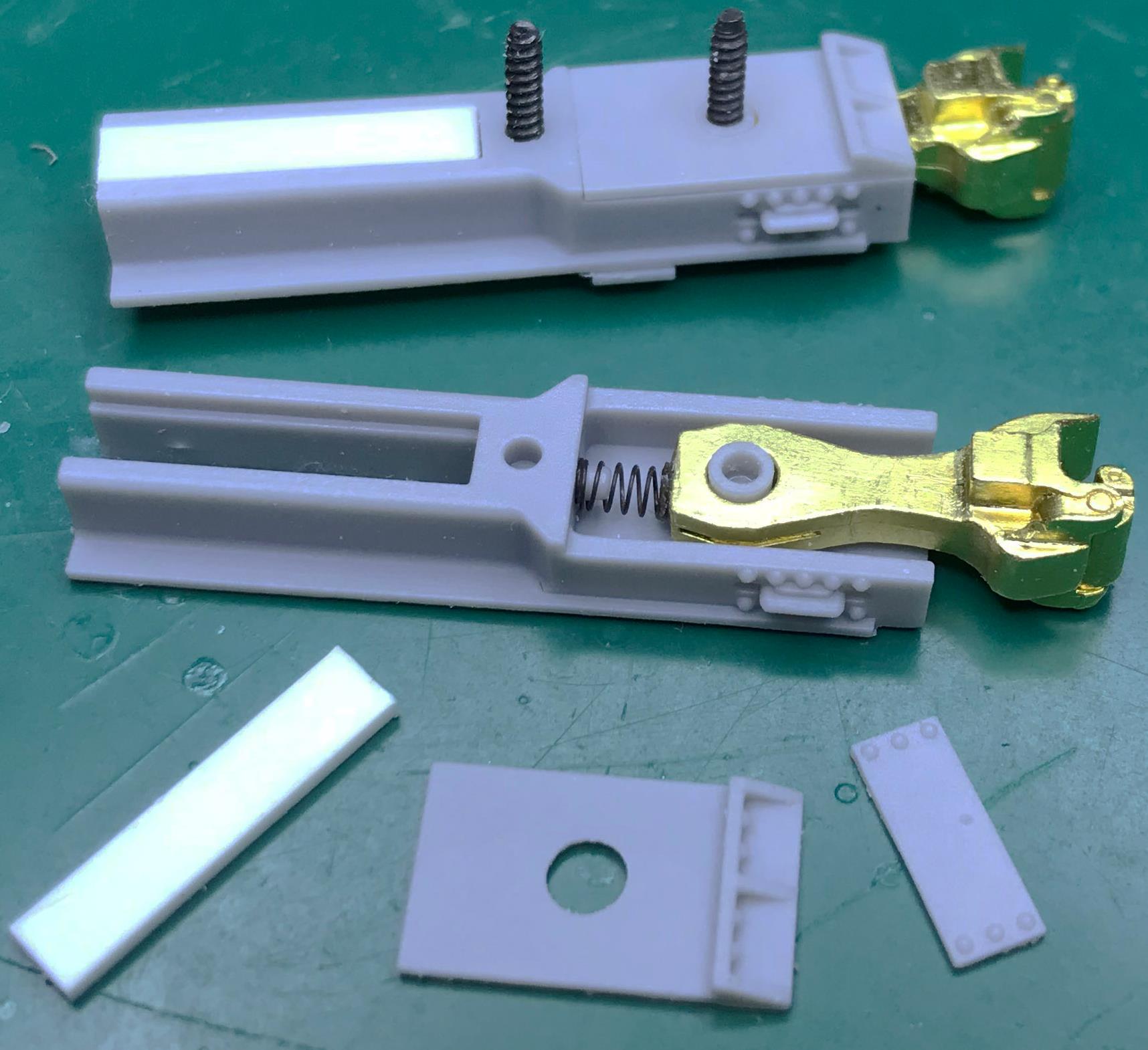 The model forms as a solid extension of the car's U-channel center sill. The large spring offers the optional self-centering feature. Designed for Sergent Engineering and Inventive Models couplers. Available as part numbers 64-DP-715 (grey), 64-DP-716 (brown), 64-DP-717 (black), 64-DP-718 (white).