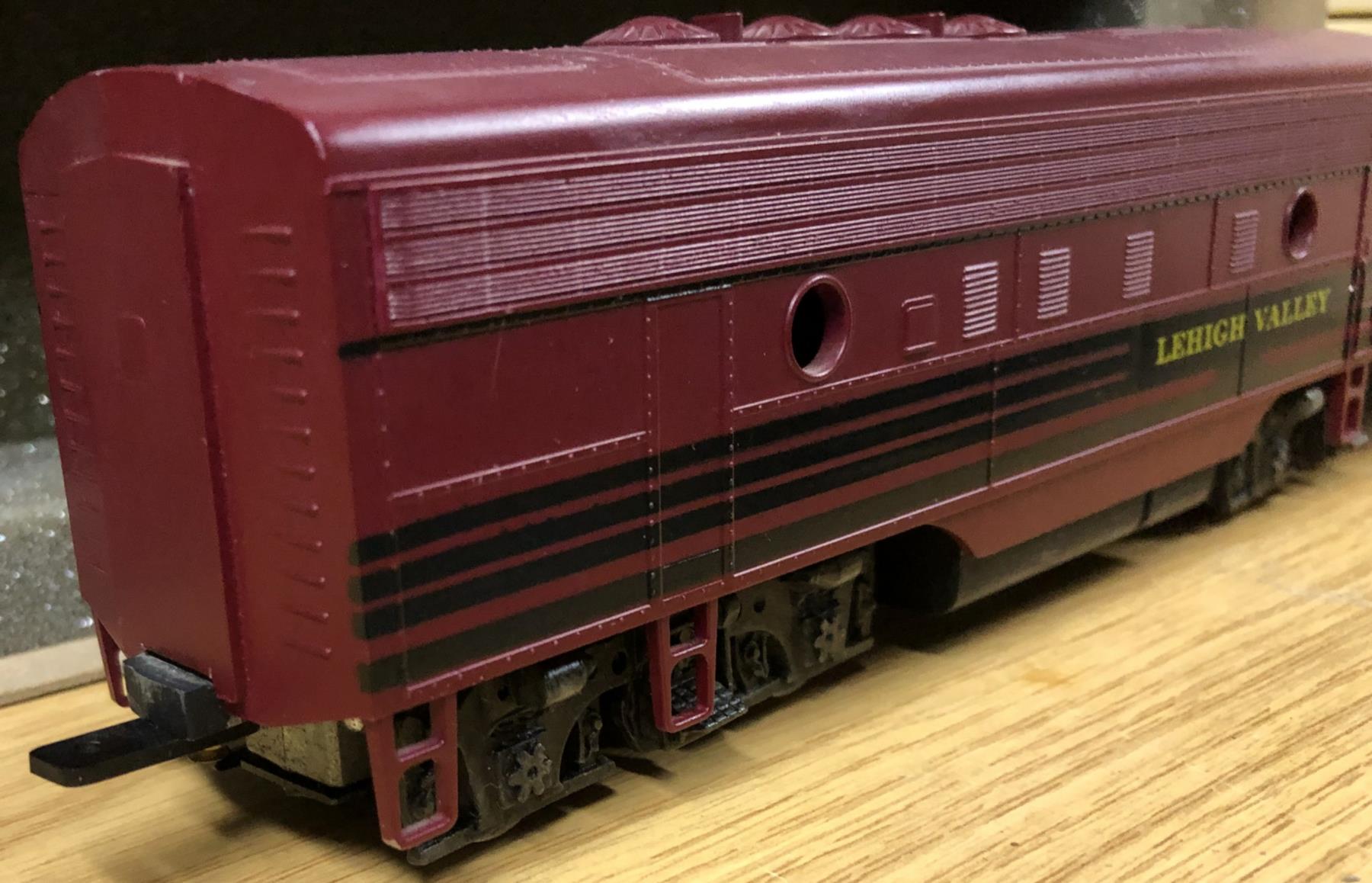 Holt Apger added a scale 4'-diameter fan on roof for dynamic brakes, air horns and number boards from B.T.S., and a motor drive and gears unit from an American Models GP9. The AM GP9 drive unit base is 8-3/4" long, and is a good fit for the F7A shell with minor corner trimming of the aluminum alloy drive base; the "recommended" AM FP7 drive unit base, at 9-3/4", is too long, and does not match up with the cutaways on the F7A shell for the drive trucks (those recommendations were made before the AM GP9 chassis was available at the time). He also trimmed the width of the metal drive base by about 1/16" with dremel and file for a snug fit; no screws used. The black paint for the Farr air grills and rooftop exhaust is Testors Model Master enamel, brushed by hand. Light gray enamel was used for the fine trim around the Farr air grills. Road numbers are from miscellaneous decals he had on hand, as well as Woodland Scenics dry transfers. He used flexible clear acrylic sheet for the window and door glazing (side windows are left open for airflow). The long coupler tabs on the AM drive unit were cut back in length and then re-drilled and tapped for the AM 2-56 pivoting coupler screws; note the smaller fixed AM coupler in front, and an operating AM hi-rail coupler has been mounted on the rear end. The roof top and front pilot weathering was brushed-on thinned Model Master flat black enamel, to give the model a mid-1950s road-worn appearance. The Lehigh Valley RR acquired 8 F7A diesels from GM/EMD in 1950, even numbers from 560 thru 574; the odd numbers were F7B units. The prototype 562 engine ran freight on the LV from 1950 until a 1972 trade-in.