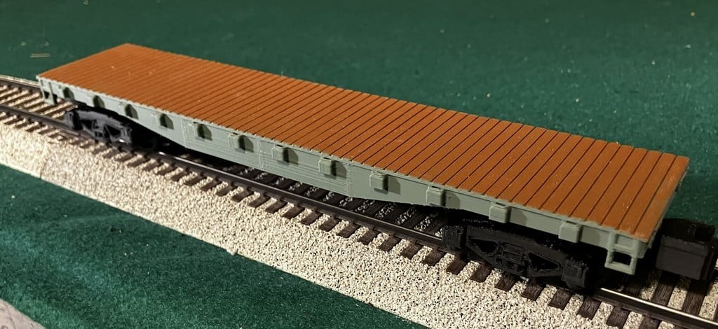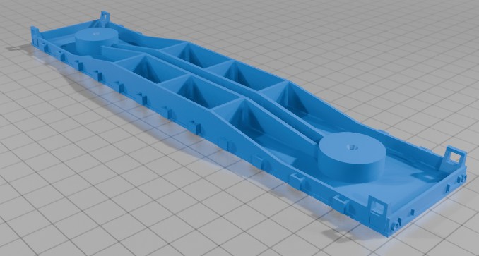 This freely-available design can be downloaded and printed to create an A.C. Gilbert-style flat car. The collection of files also contain trucks compatible with A.C. Gilbert, American Models, or S-Helper Service wheelsets.