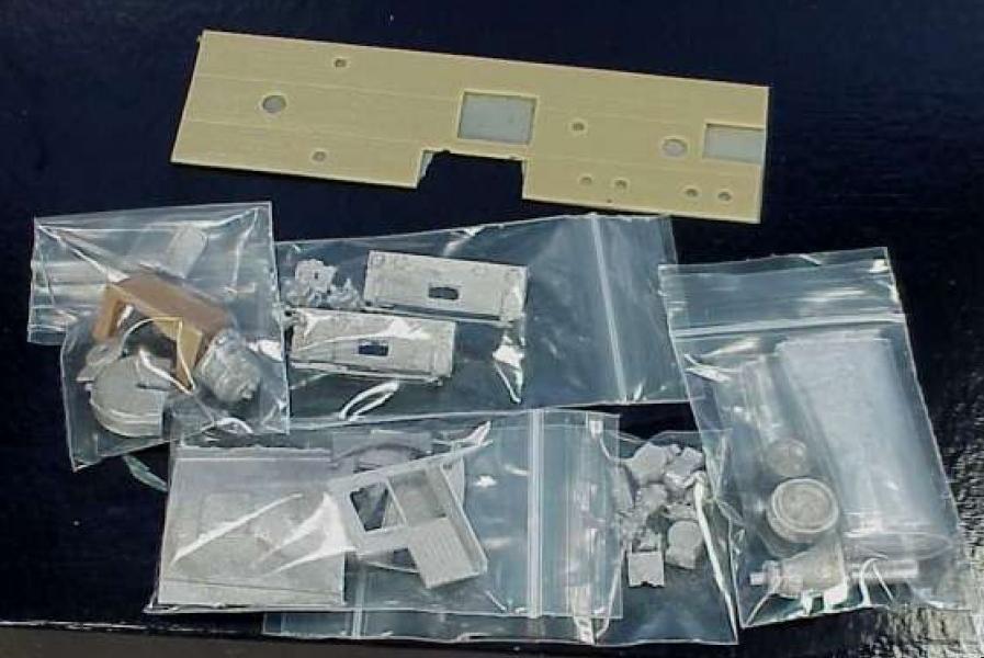 Conversion kit for the HO-scale MDC three-cylinder shay. The kit includes: cab, bolster extensions, end beams and foot boards, fire box, backhead, cab fittings, two stacks, two headlights, bell, airpump, and generator. Wiseman Model Services bought out the V&T Shops product line.