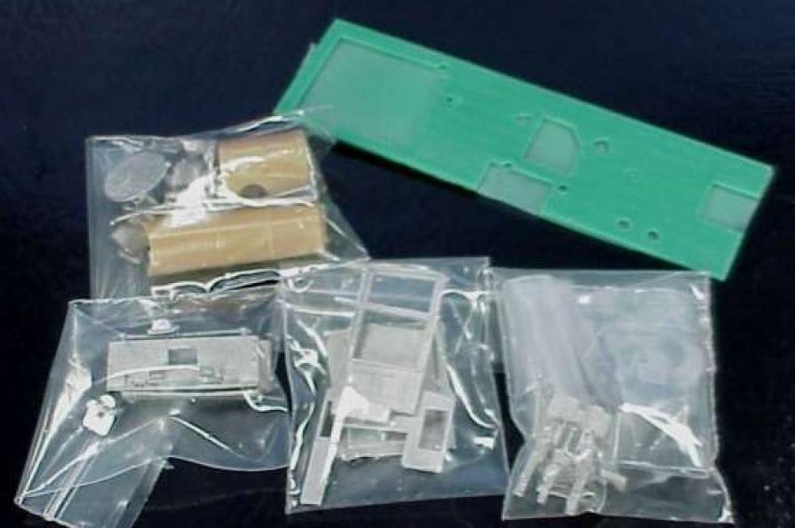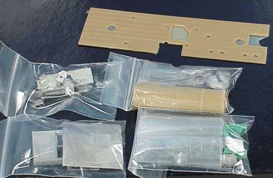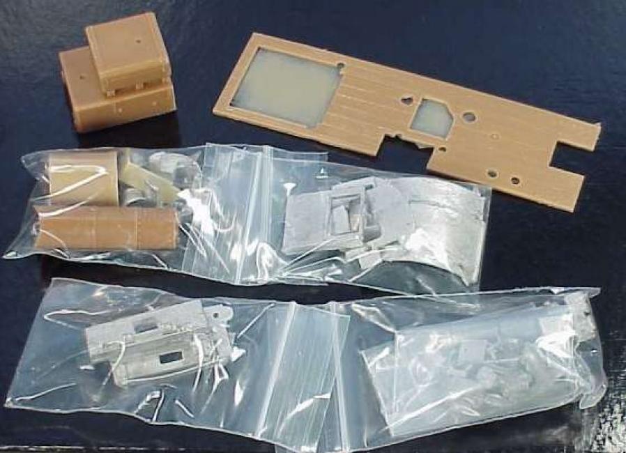 Conversion kit for the HO-scale MDC, three-cylinder, wagon-top, shay. The kit includes: cab, bolster extensions, end beams and foot boards, fire box, backhead, cab fittings, two stacks, two headlights, bell, airpump, and generator. Wiseman Model Services bought out the V&T Shops product line.