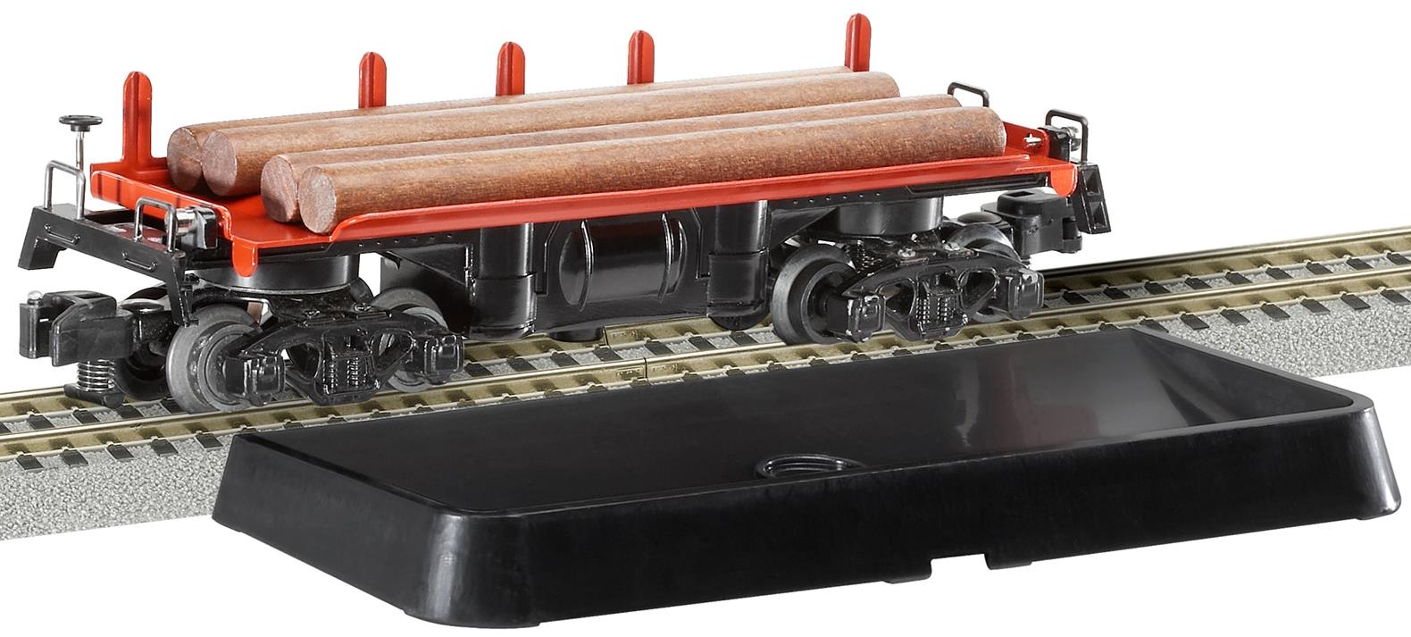 To properly animate this car's log load, the Lionel FasTrack Activator Rail (6-49895) is required. Includes operating contactor, dumping platform, and wood logs. Railroad name is listed at the top of the tray.