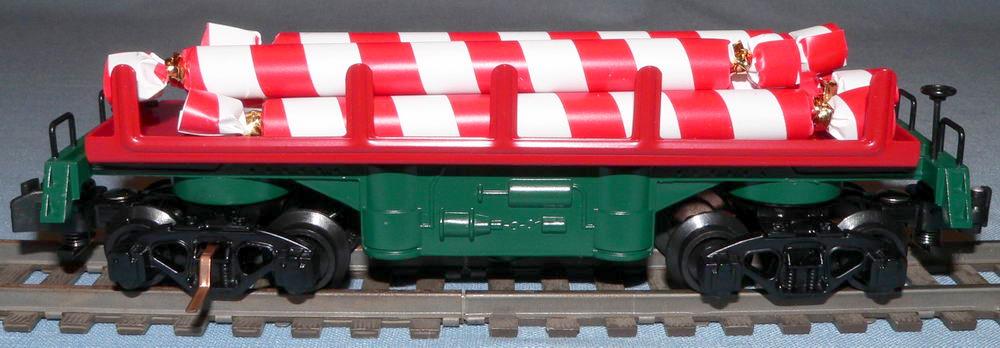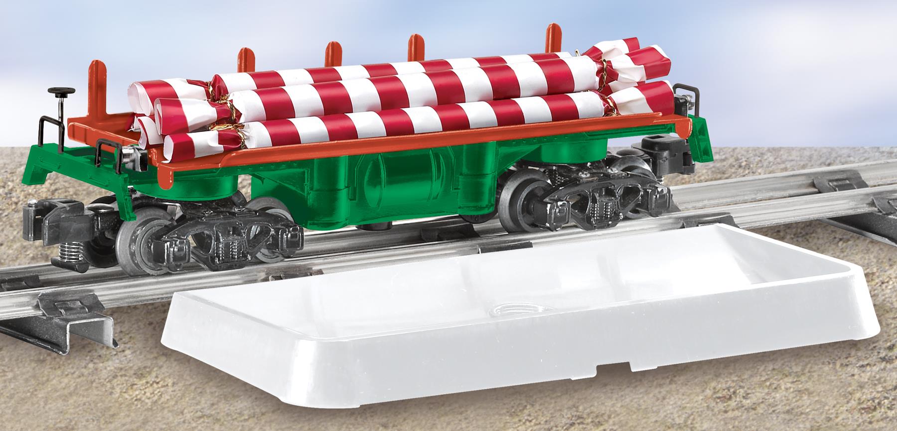 To properly animate this car's log load, the Lionel FasTrack Activator Rail (6-49895) is required. Includes operating contactor, dumping platform, and wood logs. Railroad name is listed at the top of the tray.