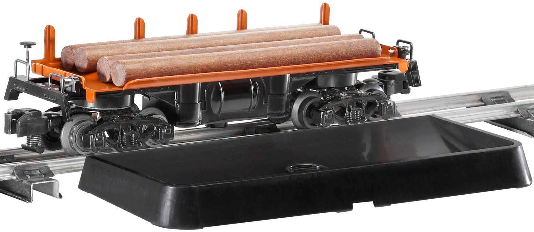 To properly animate this car's log load, the Lionel FasTrack Activator Rail (6-49895) is required. Includes operating contactor, dumping platform, and wood logs. Railroad name is listed at the top of the tray.