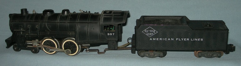 The #307 was produced from 1954 through 1957 in four variations. The first variation produced and date-stamped "Feb 1954", has a four-position reverse unit, and four fabric covered wires from the plug into the locomotive. The second variation has a four-position reverse and four direct wires to the locomotive (shown in the photo; note that this model has lost the wheels that are part of the coupler and yoke assembly between the locomotive and tender). The third variation has a two-position reverse on the back of the locomotive. The fourth variation has a two-position reverse on the back of the locomotive, a black plastic drive two-wire plug to the tender and Pull-More traction drive wheels on front drivers complete with smoke and choo-choo that none of the other three variation have. In 1957, the #307 became the #21100, which came with and without smoke and choo-choo as an uncataloged item. Ted wonders, "Could it be that the fourth variation is actually #21100 with a #307 shell that was incorrectly assembled at the factory in late 1957?"
