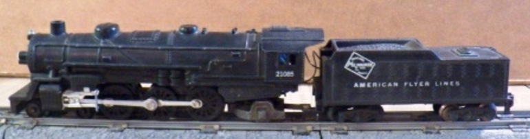 The #21161 is an uncataloged item from 1960, which has three variations. Two of the variations have the "Reading Lines" logo with "AMERICAN FLYER LINES" on the tender. Both of these variations are common and as such tend to be very inexpensive to obtain. One of these two variations is painted black over a black body while the second, shown in Photo #2, has an unpainted black plastic body. The third variation is painted black and has a tender that carries the "Reading Lines" logo along with the "AMERICAN FLYER LINES" inscription. What makes this variation rare and pricey is that the boiler unit is stamped "PRESTONE CAR CARE EXPRESS". This version is shown in the main photo.