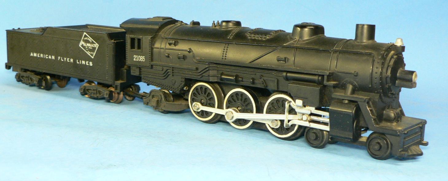 The #21085 was produced from 1958 through 1962, and, according to Greenberg, has eight listed variations. Five of the variations have the C&NW logo on the tender. The differences in these five variations include chassis design, driver material, couplers, and trucks (3 with Knuckle and 2 with Pike-Master). The three other variations reported by Greenberg are the CMStP&P versions that were all produced in 1961/62. All of which have Pike-Master trucks and couplers with the main differences being how the tender and locomotive were connected. The one variation not specifically identified in Greenberg is the CB&Q unit shown in the photo which most likely came as part of the #20813 Western 1200 produced in 1966. There are also reports that some late #21085 also has a tender marked "Reading Lines". Photo #2 has a Milwaukee Road herald on the tender. All of the electrical pickup is through the tender wheels. Photo #3 is of a very late production run of this model, where the white-wall paint on the tires has been omitted. Also, the tender is permanently riveted to the locomotive, no plug, and plastic tender trucks with a Pikemaster coupler.