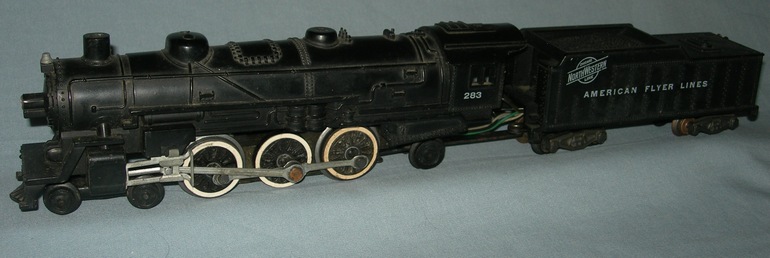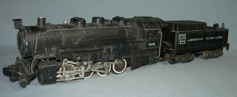 The model has a diecast boiler and tender, and labeled for both the Nickel Plate railroad and American Flyer Lines. The #343 was produced from 1953 through 1957 in four variations. The first variation produced in 1953 has sans-serif "AMERICAN FLYER LINES" lettering with the reverse unit located in the tender. The second variation, shown in the photo, was produced in 1954 that is nearly identical except the lettering of "AMERICAN FLYER LINES" which done in serif lettering. The third variation produced in 1955 and 1956 has a four-position reverse unit on the rear of the motor that did not work well which is covered by a plastic curtain. In 1957 the fourth variation was produced which utilized a two-position reverse unit that was also mounted on the rear of the motor that is covered by a plastic curtain.