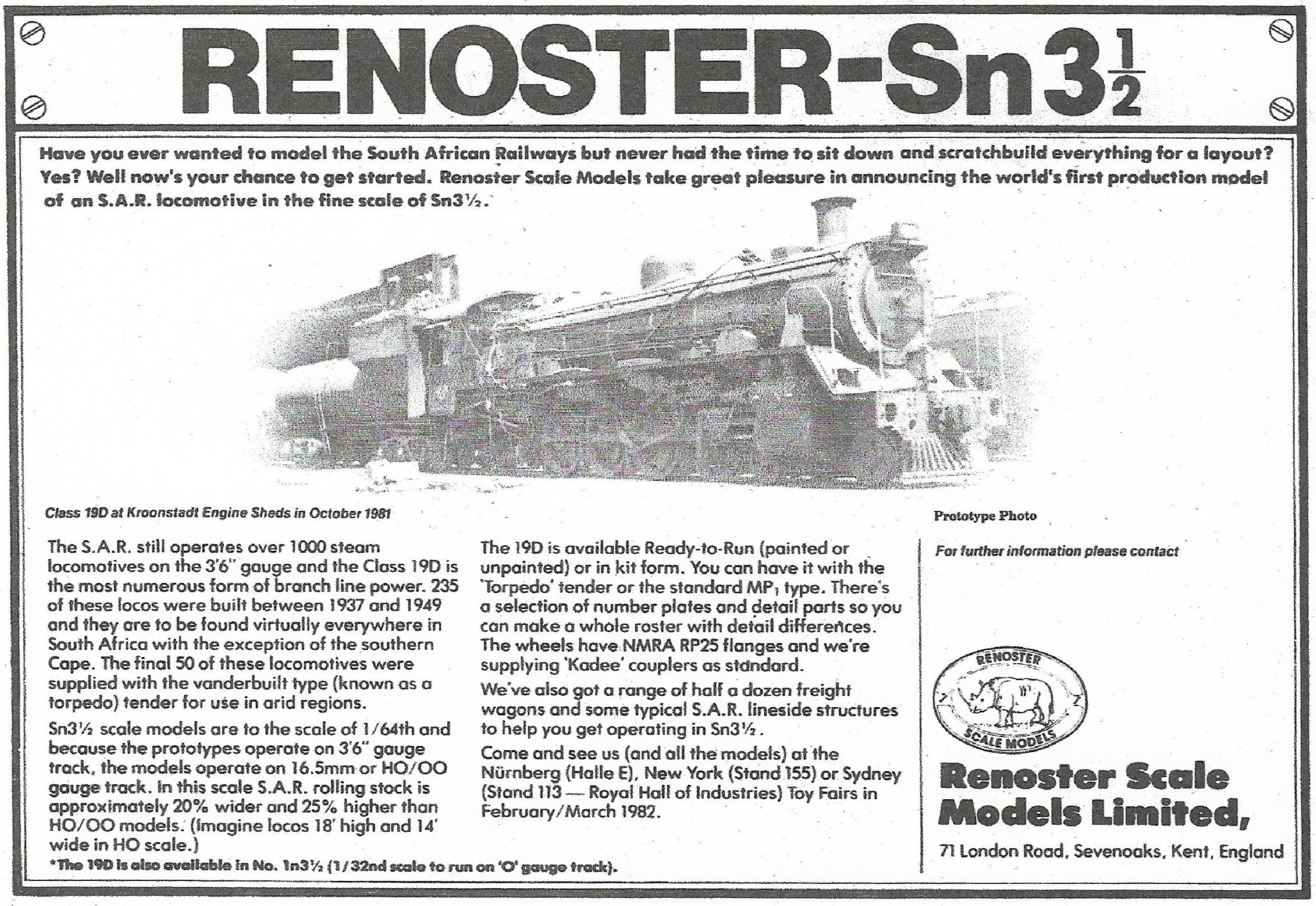 These engines ran on 3'6" gauge track in South Africa, so the 1:64 scale model can run on HO-scale track. The model was available in ready-to-run or in kit form, with two different tender types. It had NMRA RP25 flanges and Kadee couplers. This was the only product this company ever made. The ready-to-run models were kits built up by DJH Model Loco out of Consettt, England. DJH Model Loco is now owned by Squires Tools, but no longer produces this specific kit (it still does O- and HO-scale models for the SAR).