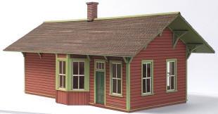 Small "Springfield Depot" with clapboard siding. The kit consists of laser-cut parts, and tab-and-notch walls, with peel-and-stick windows and roof shingles.