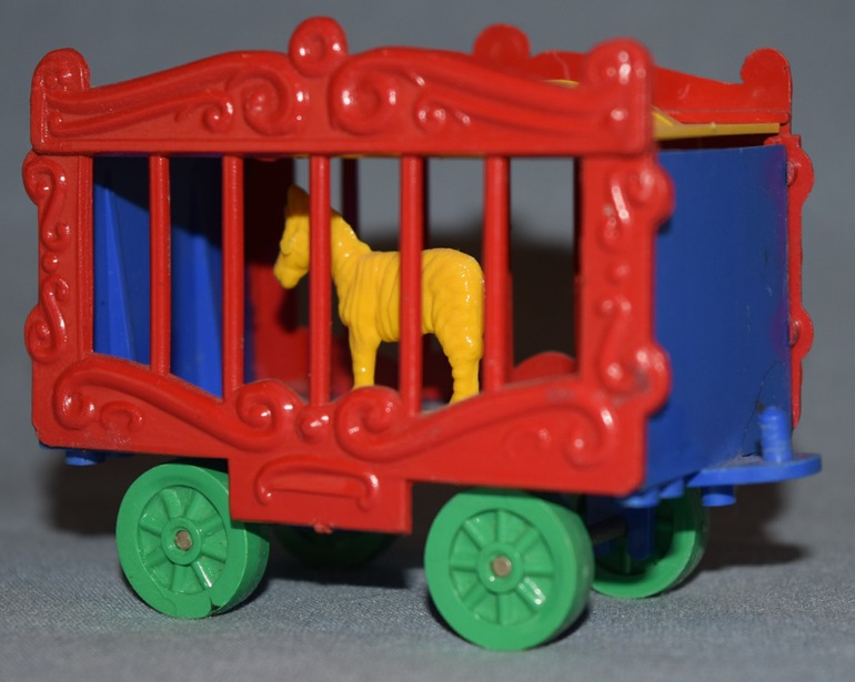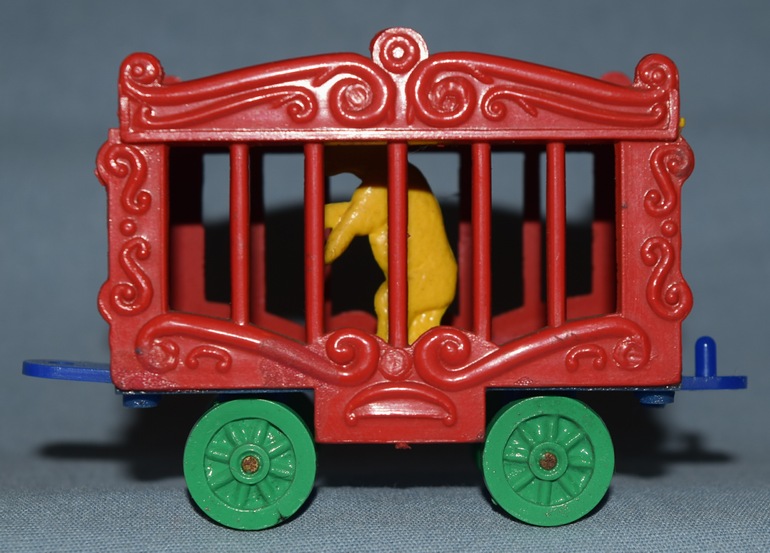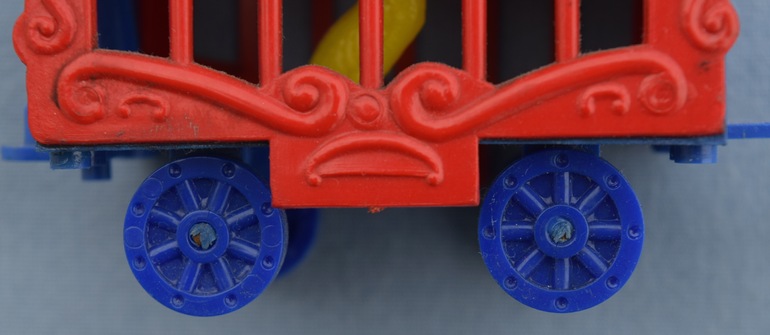 The second color configuration consists of a cage with blue sides, a green roof, and red frame. The earliest cages have dark yellow animals and green wheels. Each cage contained either a pelican, zebra, rhino, gorilla, lion, or a panther.