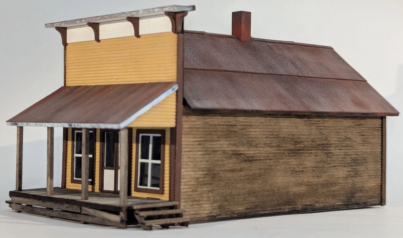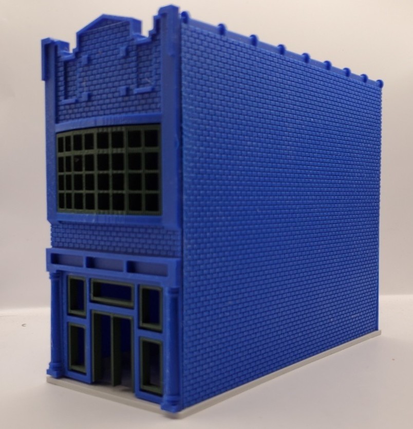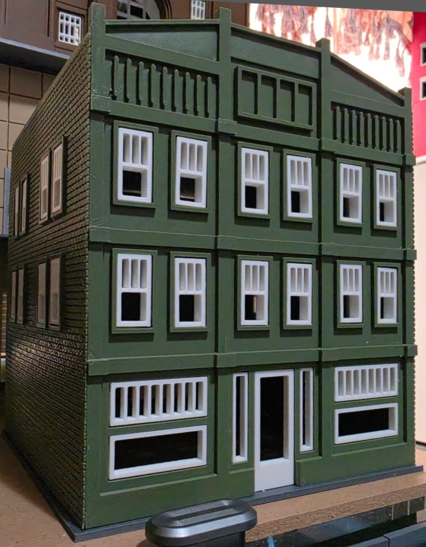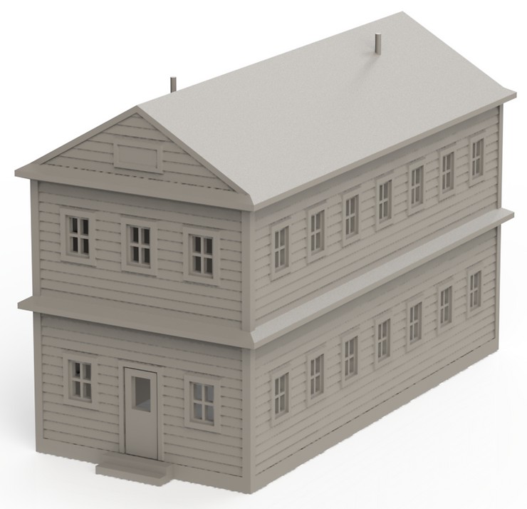 This is the company's first S-scale product (they make city scape buildings in HO- and N-scale), which represents a typical two-story row house with basement. It is 3D-printed and arrives fully assembled and unpainted. It is open at the bottom to allow for interior detailing and installing lights. It measures approximate 3-7/8" wide by 7-3/8" deep and 6-1/8" tall. The model is quite affordable, but they offer further discounts if you order multiples, to build a complete street scene.
