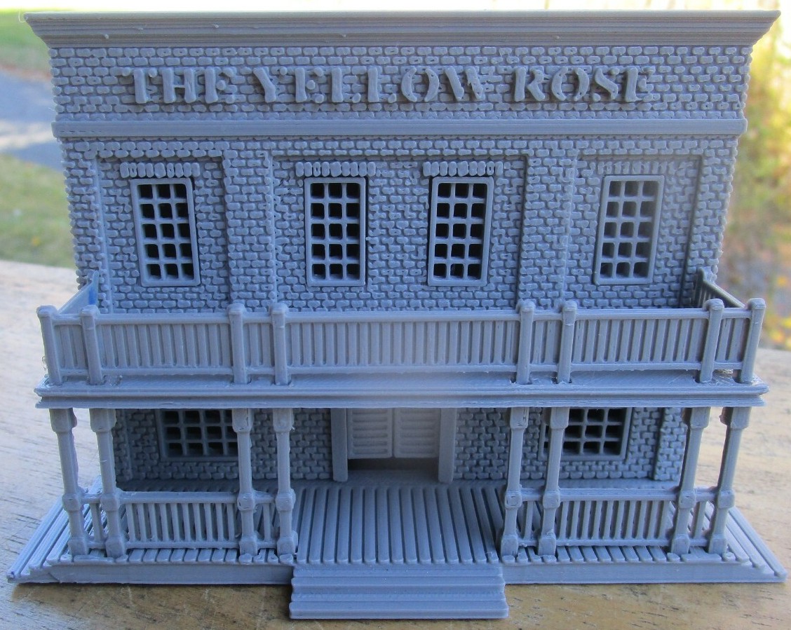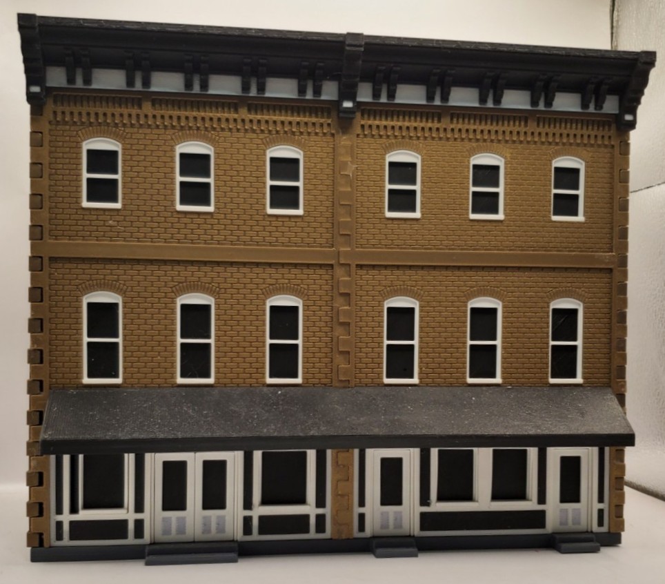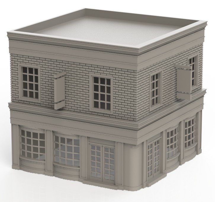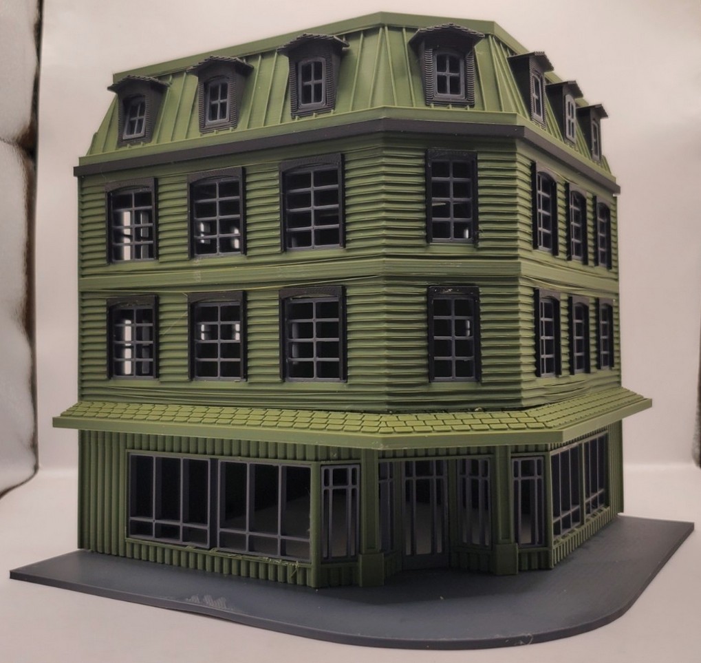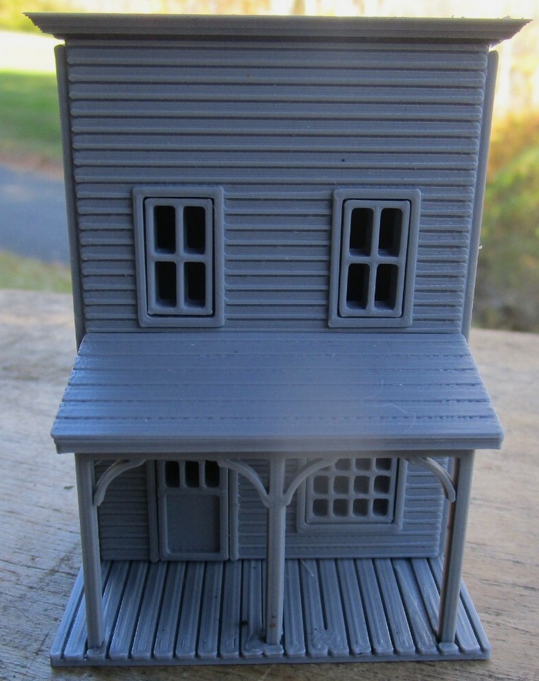 This is the company's first S-scale product (they make city scape buildings in HO- and N-scale), which represents a typical two-story row house with basement. It is 3D-printed and arrives fully assembled and unpainted. It is open at the bottom to allow for interior detailing and installing lights. It measures approximate 3-7/8" wide by 7-3/8" deep and 6-1/8" tall. The model is quite affordable, but they offer further discounts if you order multiples, to build a complete street scene.