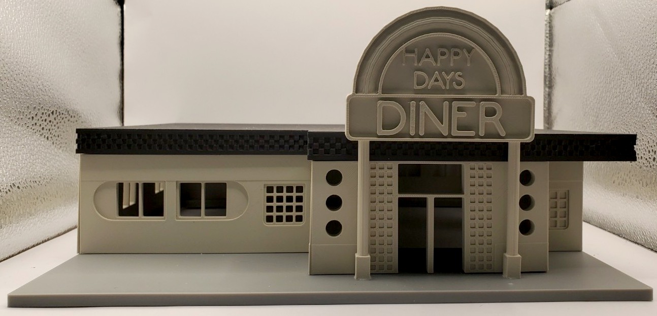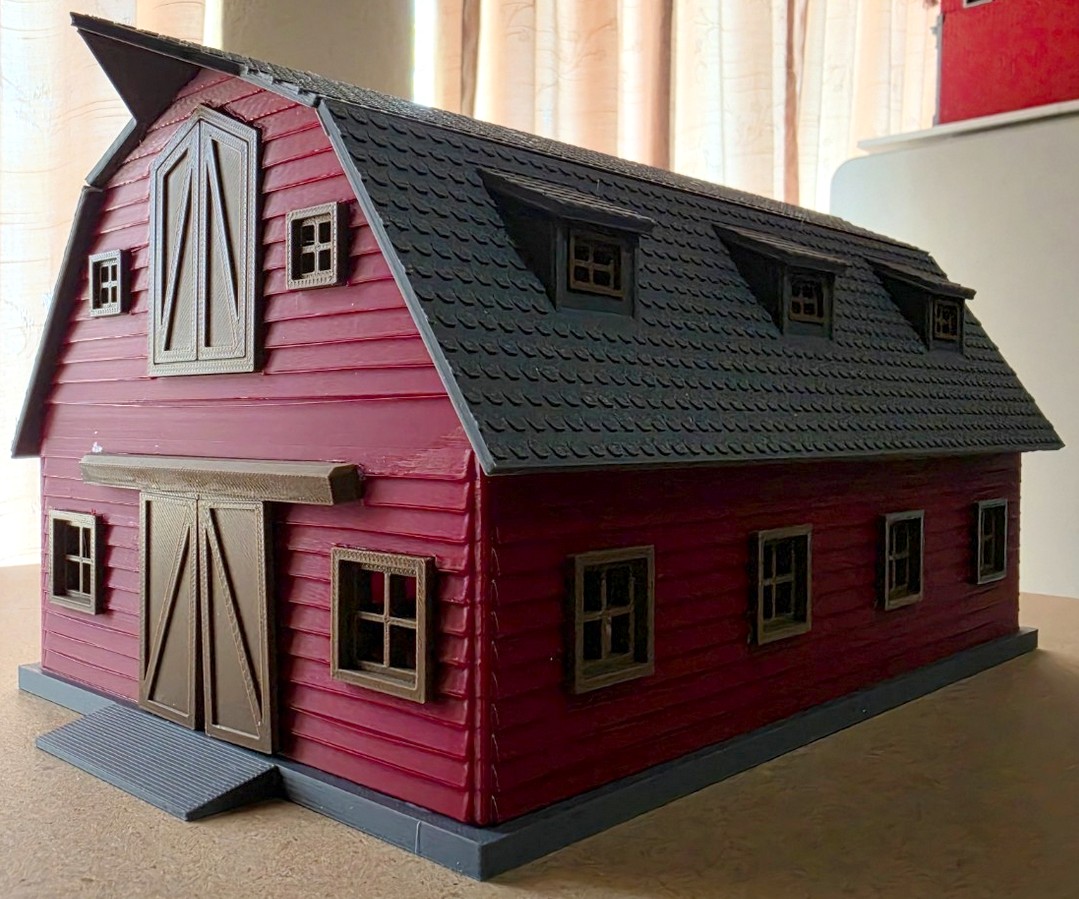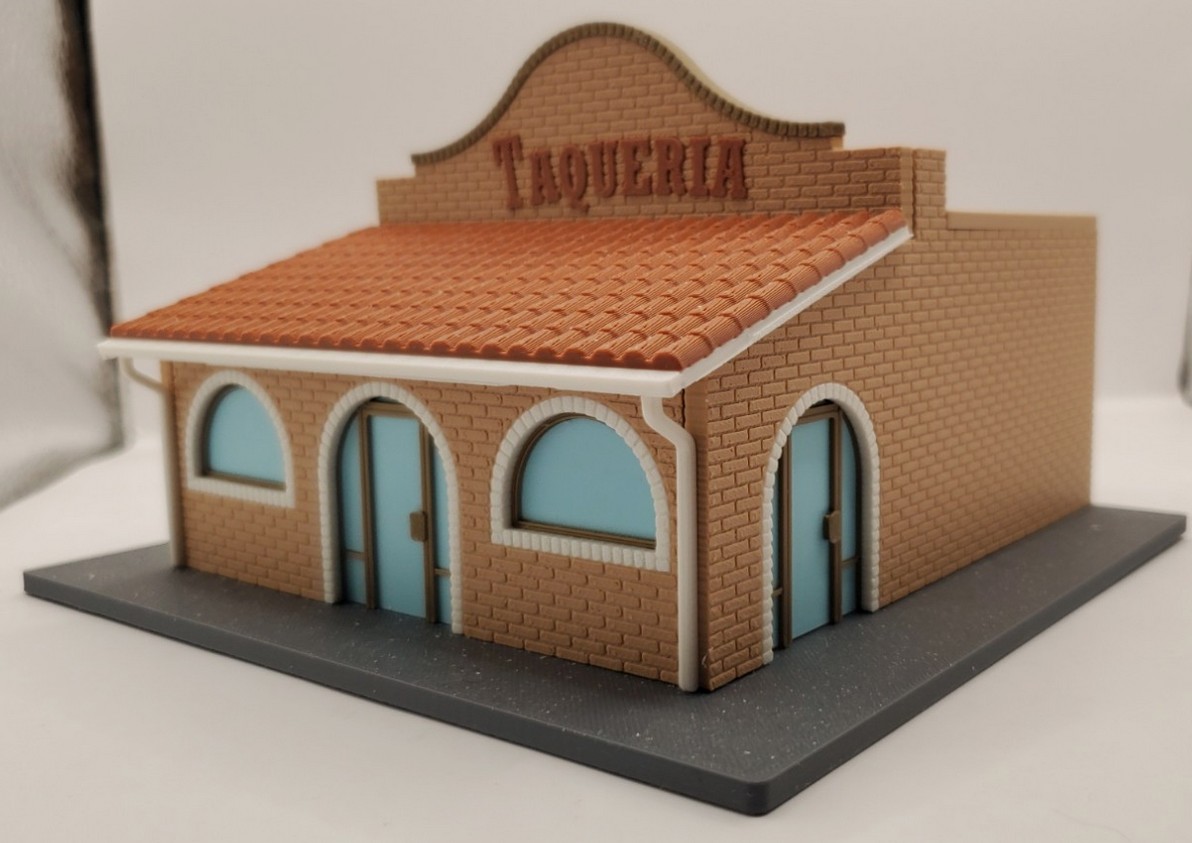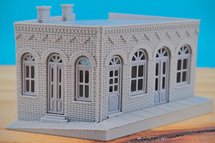 This is a 3D-printed, unpainted model that requires some assembly to complete. This is done for two reasons. One, you can paint the individual parts before assembly. Two, you can detail the interior and install "glass". The main building is one whole unit, as is the roof. The window frames are separate parts.