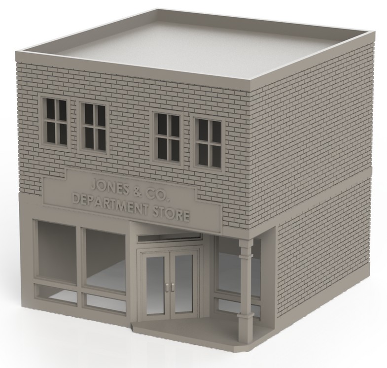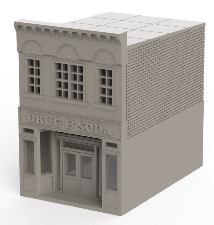 The company has released three new S-scale kits. These are 3D-printed, unpainted models. The log cabin is printed as-is, meaning no assembly is necessary; just paint and put on your layout. The Marshall, North Carolina store comes in two variants. These are kits that come with different add-on details. The main building is fully printed so no assembly required there. The roof and add-on details need to be glued by the modeler. This is because you may want to decorate the interior and add lighting before final assembly. These are based on actual buildings.