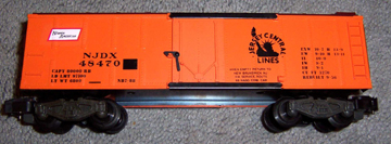 This was the official first car of the NASG American Flyer Commemorative Car project. The 1988 car was a Jersey Central Lines insulated box car (a box car shell with opening reefer doors), numbered 48470. The car sides are painted orange, and roof and ends are tuscan red. Lettering and decoration on the car is black, red, and white. Only 504 cars were produced, and they sold for $29.95 each (postpaid), to NASG members. Manufactured by Lionel (#6-48470).