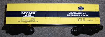 The first car was the New York Central reefer, manufactured by Lionel (#6-48476). The NYMX #491 was an NYC Mechanical Refrigerator car with plug doors. The car featured yellow sides with a dark blue stripe across the middle, and silver roof and ends. Car data appeared in the lower left, as well as "1991 NASG COMMEMORATIVE CAR". Additional car data appeared in the lower right. The NYC logo was printed in the upper right, above the blue band. In the blue band, in white print, was "NYMX MECHANICAL 491 REFRIGERATOR".