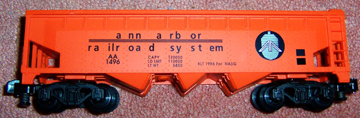 Manufactured by Lionel (#6-52094). Ann Arbor hopper with cover wears road number #1496. Doug Peck covered the history on these cars in the February 2008 issue of the NASG's The Dispatch.