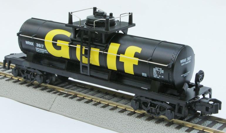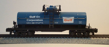 A single-dome Gulf Oil tank car, blue with white print, and orange and white logo. The tank car features top platform and ladders, diecast freight trucks, and operating knuckle couplers. Manufactured by Lionel (#6-48224); they produced 750 models. Doug Peck covered more of the history on this project in the October 2010 issue of the NASG's The Dispatch.
