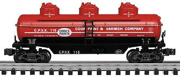 A Cook Paint & Varnish Company triple dome tank car, red with white print. The tank car features diecast freight trucks, and operating knuckle couplers. Manufactured by Lionel (#6-48228). Doug Peck covered more of the history on this project in the June 2011 issue of the NASG's The Dispatch.