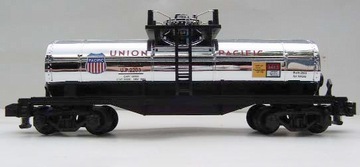 The Union Pacific single-dome tank car has a chrome finish with a black base and frame. Print and decoration are black, red, white, yellow, and blue. The tank car features a chemical platform and ladders, die-cast freight trucks, and operating knuckle couplers. Car number is 2203. Manufactured by Lionel (#6-48233). Doug Peck covered more of the history on this project in the June 2011 issue of the NASG's The Dispatch.