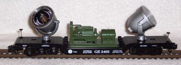 A diecast depressed-center flat car with generator and two diecast searchlights. The black flat car is lettered in white for General Electric. The car features diecast six-wheel freight trucks and operating knuckle couplers. Car number 2405 was manufactured by Lionel. Doug Peck covered more of the history on this project in the December 2012 issue of the NASG's The Dispatch.