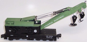 Continuing the theme of a GE work train, this Brownhoist crane was introduced this year. From the December 2012 issue of the NASG Dispatch, in an article written by Doug Peck, "The crane had a black diecast frame in the style of the Gilbert 944. Each end of the frame featured diagonal silver warning stripes. The cab was also painted black, with a green roof, and a green boom. It had the usual two cast hooks and counterweight. Like the first two cars, the six-wheel diecast knuckle coupler trucks had non-flanged wheels on the center axles. 2506 was the car number, with a Lionel SKU of 48250. 700 cranes were produced, and sold for $85 each, shipping included". Doug Peck covered more of the history on this project in the December 2012 issue of the NASG's The Dispatch.
