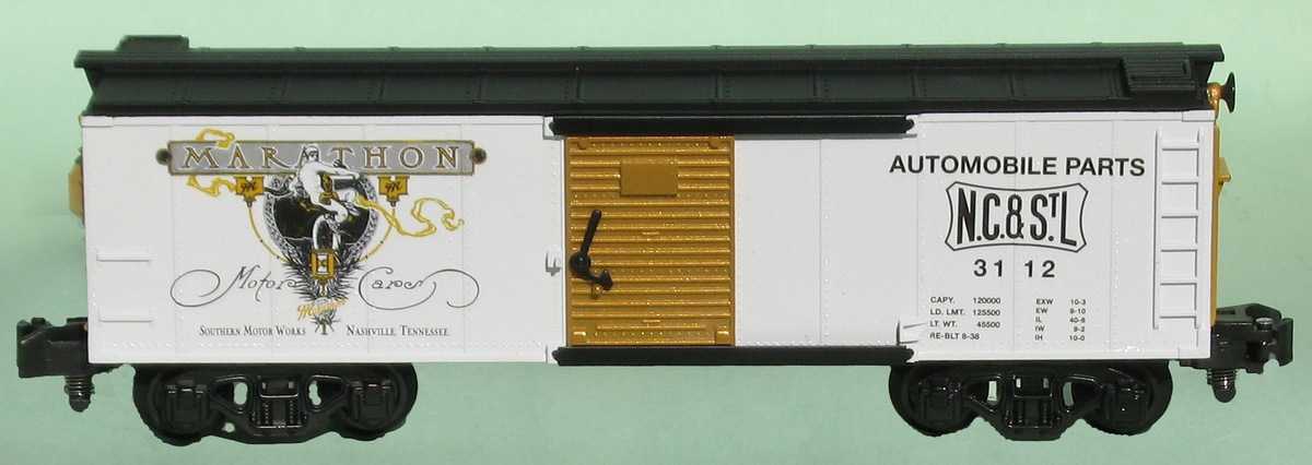 The NASG contracted with Lionel to produce a limited run (375 cars) of this 2012 American Flyer commemorative Marathon Motors box car. The box car is white with gold ends and doors, and a black roof. The Marathon Motors logo is gold, black, and silver. Marathon Motors was located in Nashville, TN, and the Auto Parts box car is lettered for the Nashville, Chattanooga, and St. Louis Railway. Chattanooga was the location of the 2012 NASG National Convention. The car number is 3112 representing the 31st car in the NASG series, and the year 2012.