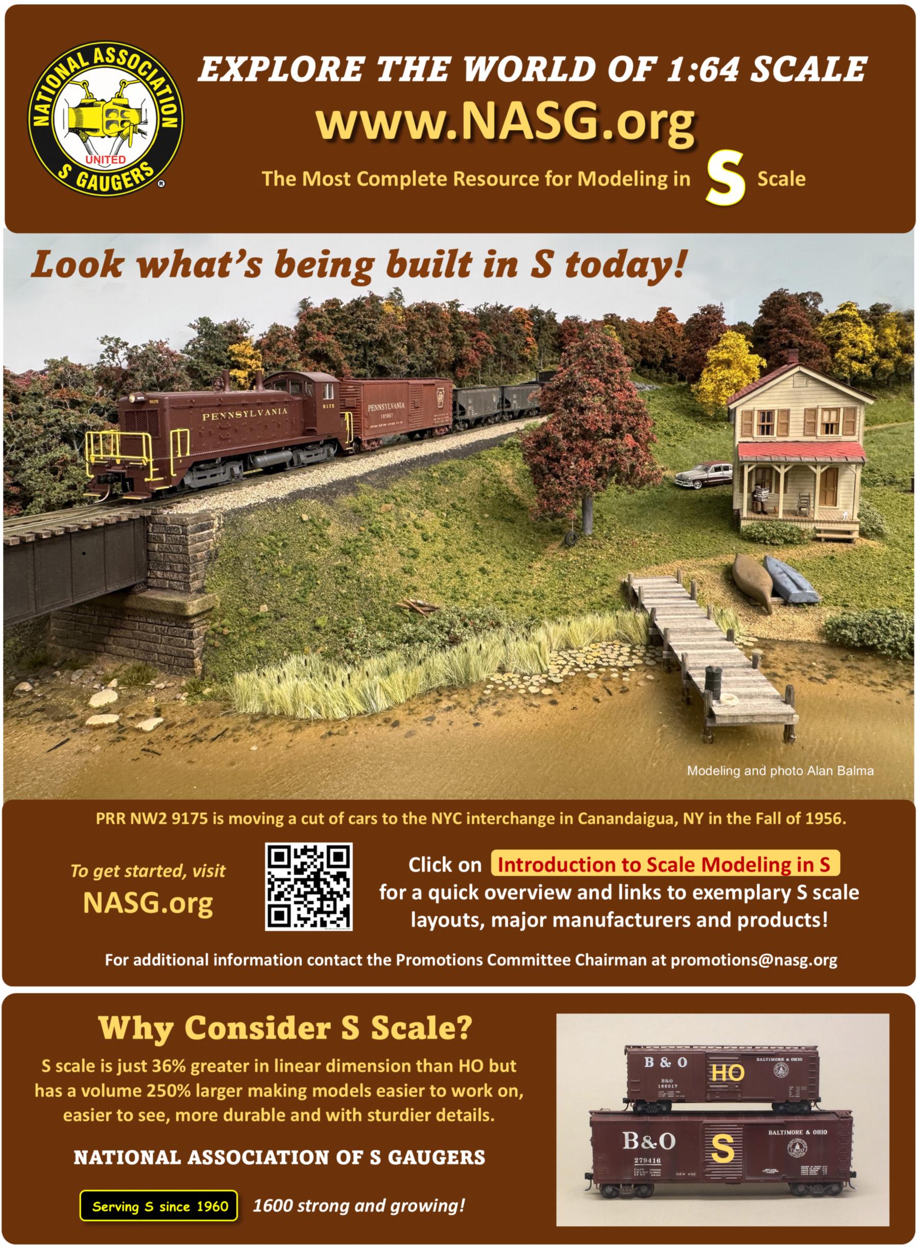 Beginning with the May 2022 issue, the ad has been completely redesigned to be more impactful. However, running the same ad each month leads to the reader glossing over the ad. To avoid that, we are running a series of ads that feature a large photograph of exemplary S-scale modeling, like the modeling you're doing right now! The photo gets the readers' attention and drives home that S is a viable scale for quality modeling today. The text around the image directs the readers to this NASG web site where they can get all the help they need to model in our favorite scale, and it explains that the NASG is here to help.