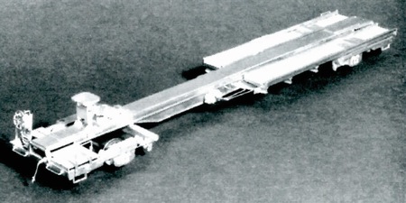 In July 1999 the NASG BOT commissioned 200 brass cars from SouthWind Models. These were to be the TTUX Front Runner intermodal spine cars, available only with scale wheels as hi-rail wheels would interfere with their operation. Two versions were to be produced, with five road numbers each. The photo below shows a pre-production model used for testing the rigid wheels to handle model curves.