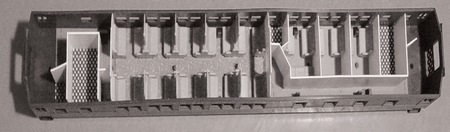 The passenger car seats manufactured by Palace Car Co. were such a success that the NASG teamed up with them again to produce a set for a full interior. Two versions of these beautiful kits include all seats, seat arm rests, partitions, floor material, and instructions for 12-1 and 10-1-2 heavyweight Pullman cars (for the ones produced by American Models in 2004). The full set can be seen in the photo above for the 2006 entry, and these are still available today via Pre-Size Model Specialties. Dick Karnes wrote a more detailed article about this project in the December 2007 issue of the Dispatch. The photo below shows an example installation.