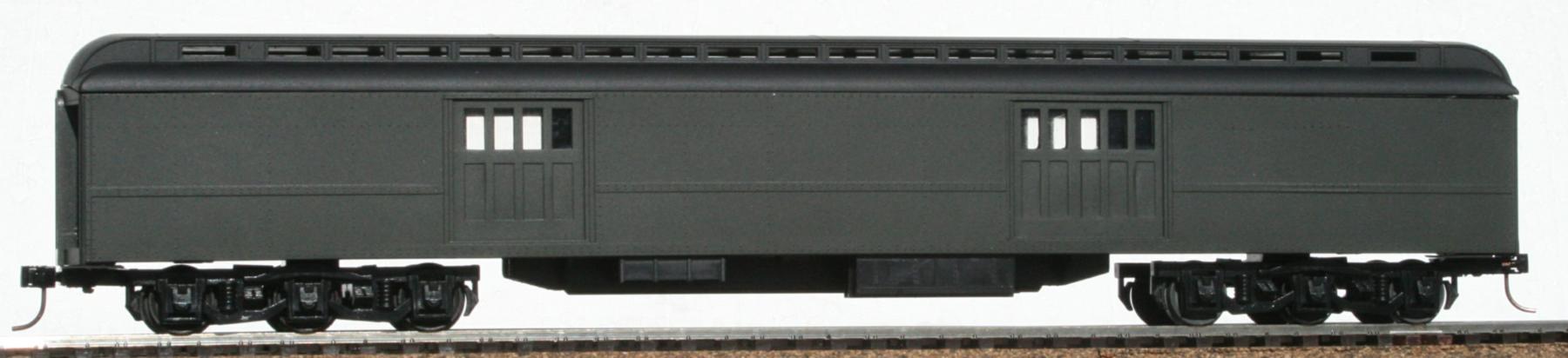 The NASG commissioned American Models to produce heavyweight baggage cars as a separate item. The car was previously only available as part of the five-car PRR passenger car set that American Models has. The cars arrived painted Pullman-green, but were undecorated. They had a black roof and underbody. They were available with either 4-wheeled or 6-wheeled trucks, with the 4-wheeled ones being in limited supply. By default, all wheels were "scale" wheels, but hi-rail versions were available. The photo shows Kadee couplers installed, but those were not provided with the model.