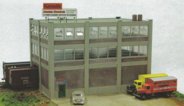 Kermit's Kleaning Kemicals was a modular brick building kit. The plan was to develop a system of brick building wall components, similar to what the company Design Preservation Models offers in N-, HO-, and O-scale. The building, when built as suggested, has a footprint of 8" x 12", and stands 8" tall. It sold for $99.95.