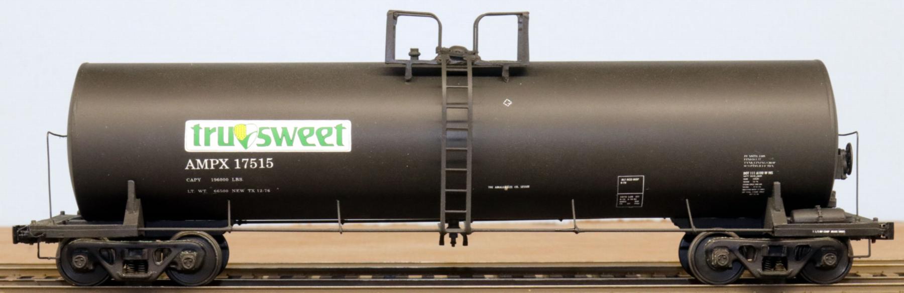 The BOT also approved the purchase of 300 models of the Downs Model Railroad Co. 23,000-gallon modern tank car. It was painted black and available with three different road numbers. On one side of the car was the "Trusweet" logo, which is a white background with green and yellow letters, while on the other side are the words "Trusweet" and "Amaizo". The models were available with either scale or hi-rail wheels and couplers, and cost $40 ($1.50 extra for operating hi-rail couplers).