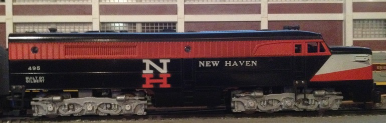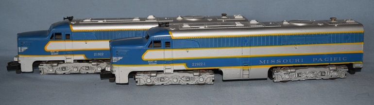 The 495 came as the 4945, a set of two A-units with numbers 494 and 495. 494 has dual motors. 495 has diesel roar and horn sound in it without a motor. In 1957 a single PA with a single motor was cataloged as 497 and as 21561 (uncataloged). Late in production it also came with the molded on steps. The model shown in the photo is of a 495 with a single motor, and it was likely made up from left-over shells at the factory, or had a replacement shell put on it by a repair station.