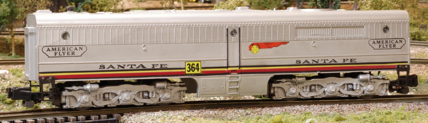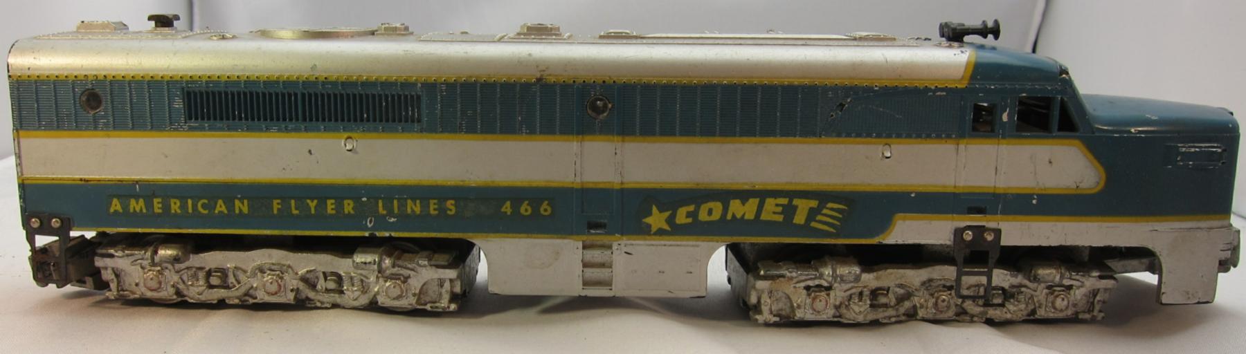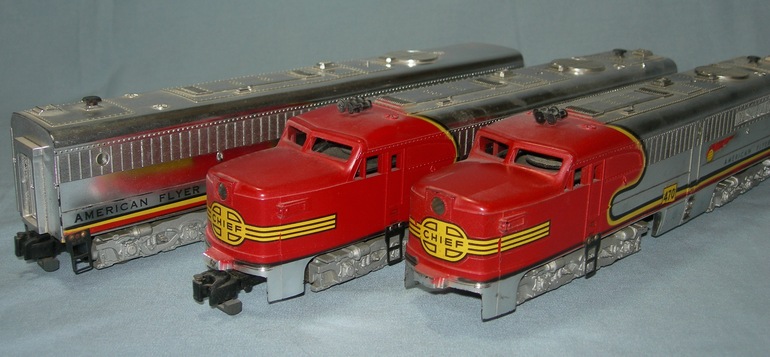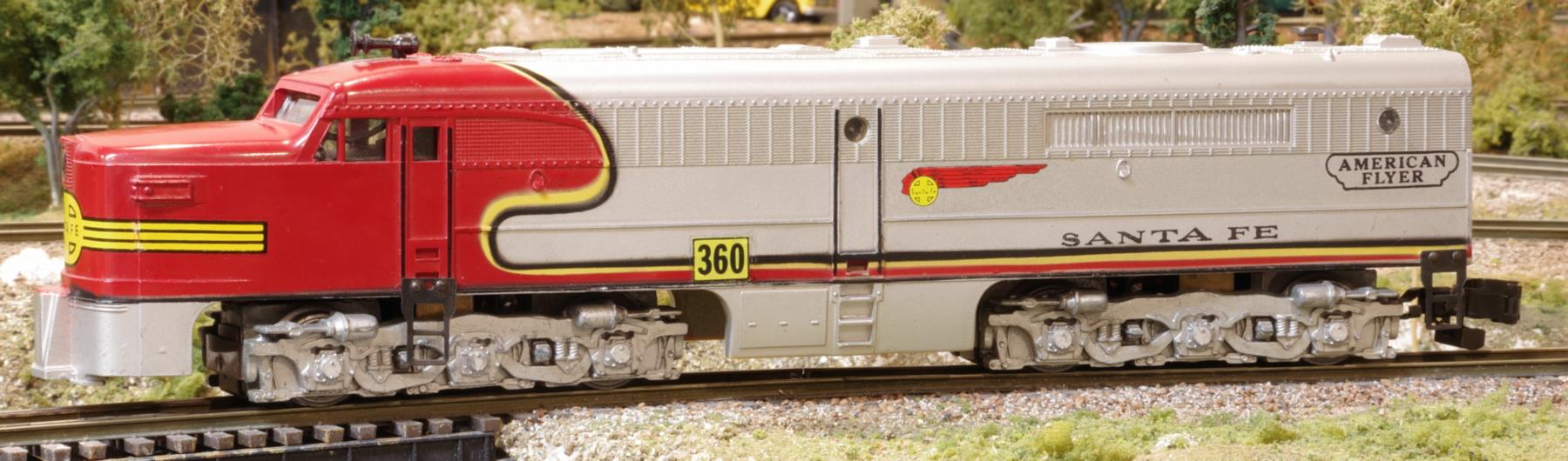 The PA was A.C. Gilbert's first diesel model, with Santa Fe being the first road name used. The first paint scheme was the all-chrome one, then later the Warbonnet version was added. The red-and-silver paint scheme was introduced later and was manufactured for 12 years. Both A- and B-units were made. The #360/#361 set of the A-B-units, shown in the photo, were cataloged as "#362" (shown in the catalog with red stripe and the Santa Fe Warbonnet). Of the six variations, only three have the Warbonnet. The unit in the photo without the Warbonnet is unusual as is it has a yellowish chrome-finish with wire handrails. It was produced for only a few months in 1950 making it the rarest of all of the #360/361.