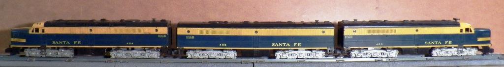 This is an PA-PB-PA set. For two years A.C. Gilbert made this version of the PA in the Santa Fe "Freight" paint scheme. The locomotive features twin motors in the 484, "diesel roar" and "air chime" whistle in the non-powered 485 B-unit, and a headlight in the 486 non-powered A-unit. All three units have knuckle couplers front and rear. Variations: metal steps held on by two rivets or one eyelet. This same locomotive set came in late 1957 and 1958 as a five-digit numbered engine: ID #21910, road numbers: 21910 (A-unit with twin motors), 21910-1 (B-unit with horn and roar), and 21910-2 (non-powered A-unit). A separate B-unit was made. #21720 with horn and roar, very uncommon and sometimes found in a box marked 21910-1. In 1960 apparently some left-over 484 and 486 A-A locomotives (no B unit) were sold as ID #21929 (uncataloged engine). #20380 was a three-unit set sold in 1956 and 1957.