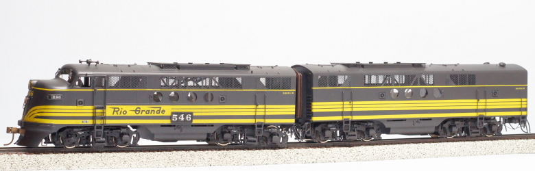 This is a matched pair of an A- and a B-unit, both powered. These are the dynamic brake versions. They are connected with a drawbar, but that can be replaced with couplers. These were specifically for the AT&SF, MP, and D&RGW versions, which had large side number boards.