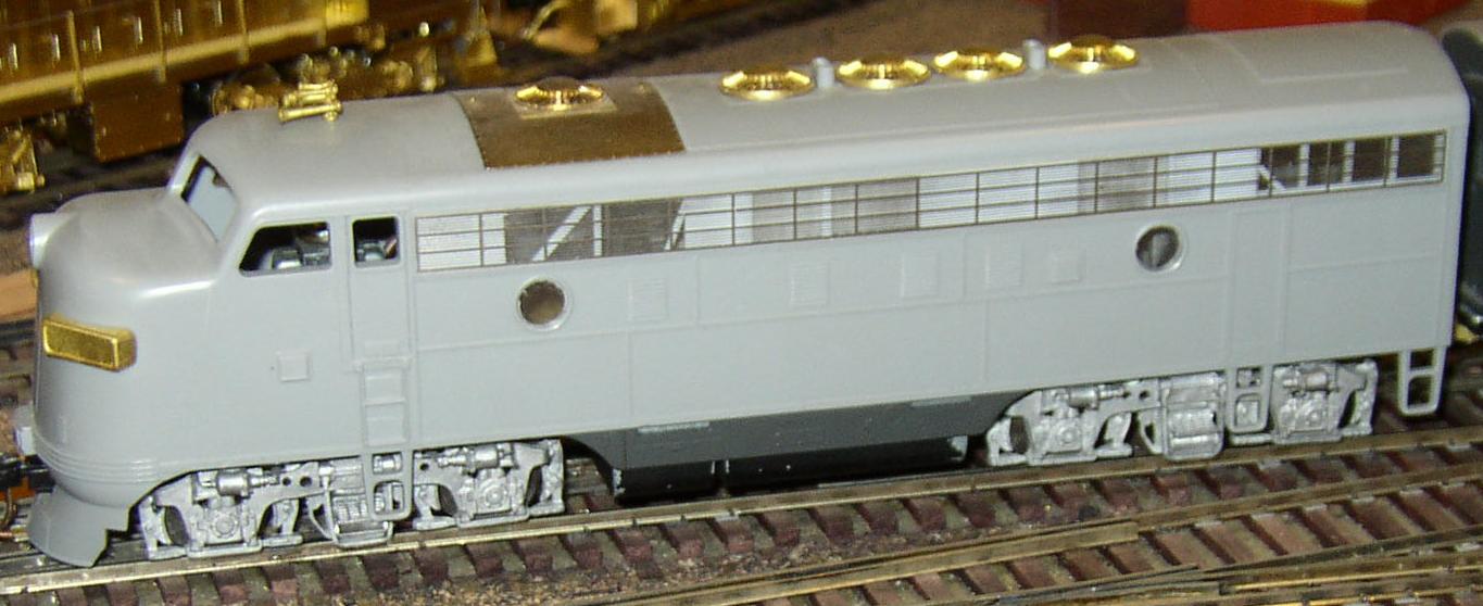 The Wabash Valley shells are an improved version of the Enhorning F-unit casts (the Enhorning ones had a deformation on their roof top and a crease on the side). Compared to prototype photos, the Wabash Valley Models shells represent F3 phase IV (9/1948 to 2/1949) EMD bodies. The shell has the slight "V"-shape above the rear end flat door panel, which is consistent with F3 body ends, but there is no roof overhang. The shell has the two rectangular roof vents for the dynamic brakes which are an F3 phase IV feature. Some shell modifications would need to be made by the modeler to represent a true F7. Originally, the recommendation was to use an American Models FP7 chassis to power these models. However, the American Models GP9 (which was not available back then) is a much better fit and will only require some corner trimming of the GP9's metal base. Also, the trucks line up better with the shell. Additional details, such as simulated glass and couplers will need to be added by the modeler for a complete model.