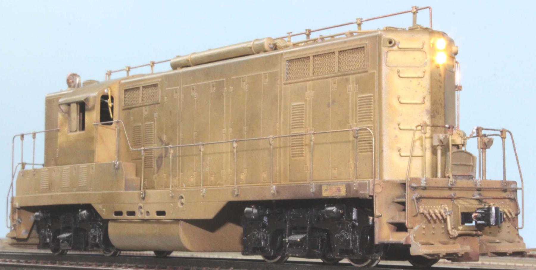 This is the freight version. Uses rubber belt drive system (these can be replaced with McMaster-Carr part #1679k164). The shell is made up of several pieces. The frame, platform, and hand rails are one piece. The cab and the hoods each are separate pieces. There are two flat "can" Canon motors inside the hood, one at each end. This was one of the last models manufactured in Japan (before brass manufacturing moved to Korea). These engines were originally gauged for the older NMRA S-scale standard.