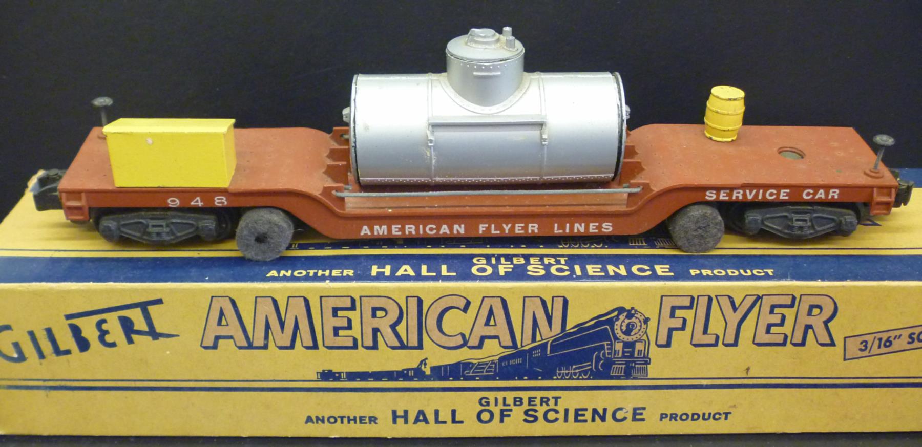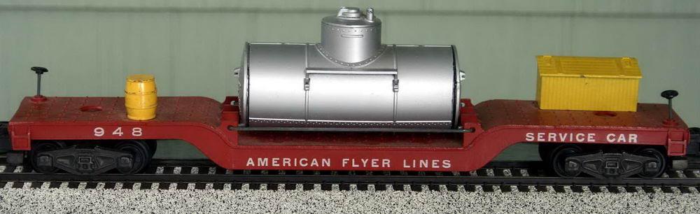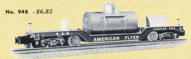 This is a track-cleaning car. If you compare this car to #636, you'll notice that these use 4-wheel trucks, whereas #946 uses the prototypically-correct 6-wheel trucks. The space of the "missing" axle is taken by the track-cleaning rollers. These models were made through 1957. The leading wipers are saturated with the cleaning fluid (held in the tank "load"), and the trailing wipers dry the rails. A.C. Gilbert #27 Track Cleaner was the recommended product to use. This version used the knuckle couplers.