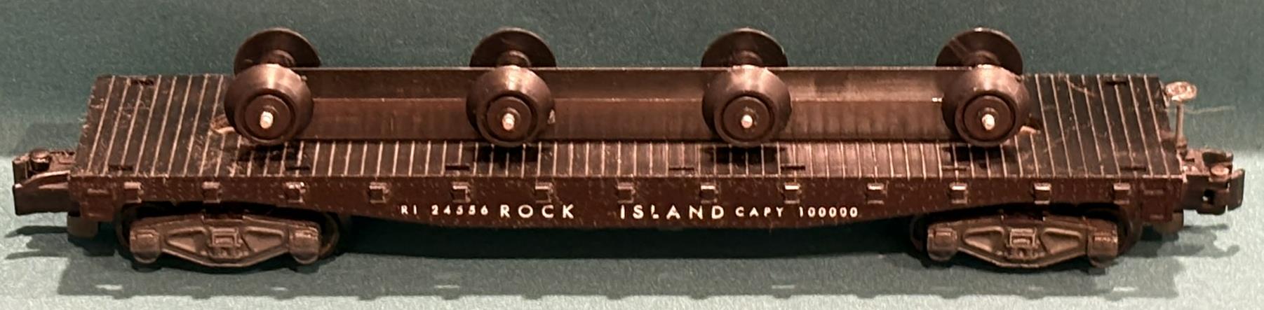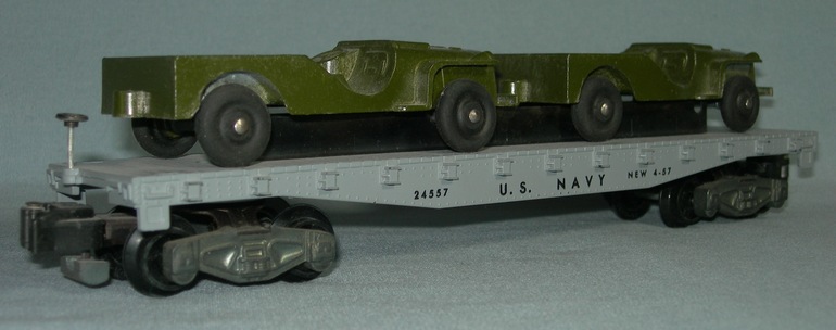 This car, with its Jeep load, was produced through 1961 in two variations. One variation has a two-piece brake wheel, as shown in the photo. The second variation has a one-piece brake wheel. The jeeps on this flatcar were manufactured and stamped "TOOTSIETOY MADE IN USA".