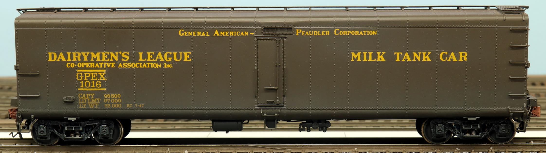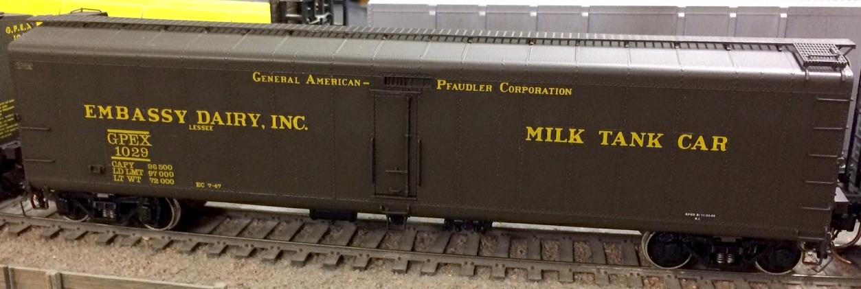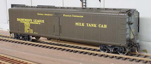 This is a dedicated express milk, run in passenger trains. These models were imported by Overland Models for River Raisin Models. The models were factory-painted green. The box included ten private road name decals. The small loading doors are sprung. The model included the correct Barber S-1-L-P high-speed trucks. One additional model was imported that was unpainted. In the real world, these cars contained two insulated tanks inside, much like the Linde gas tanks inside a standard box car.