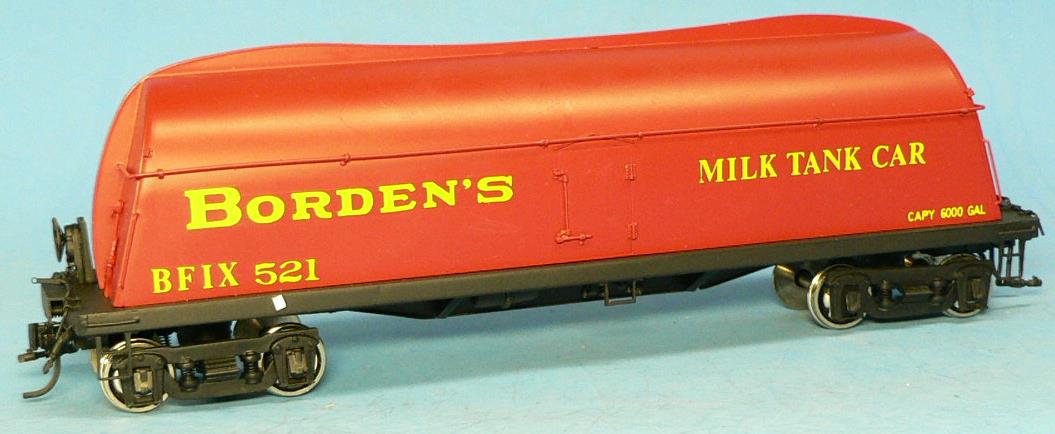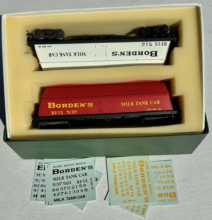 This is essentially a flat car with a removable shroud that protects two glass-lined tanks. This model represents the original 1936 version that had fins on both the top and the ends of the shroud. This version's brake wheel is on a dedicated stand. The SouthWind models arrived unpainted with a clear, semi-gloss lacquer applied. The shroud is attached with four screws from below. At the time these cars came out, River Raisin Models had appropriate decals available for the three known prototype lettering schemes. The model IDs are as follows: