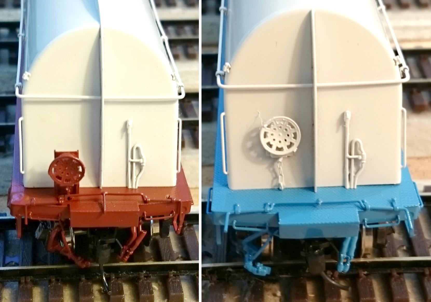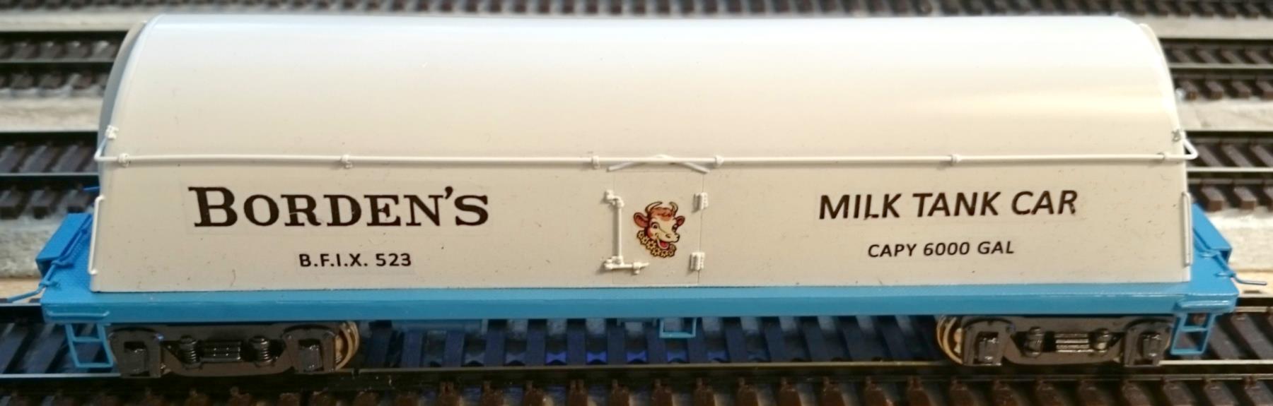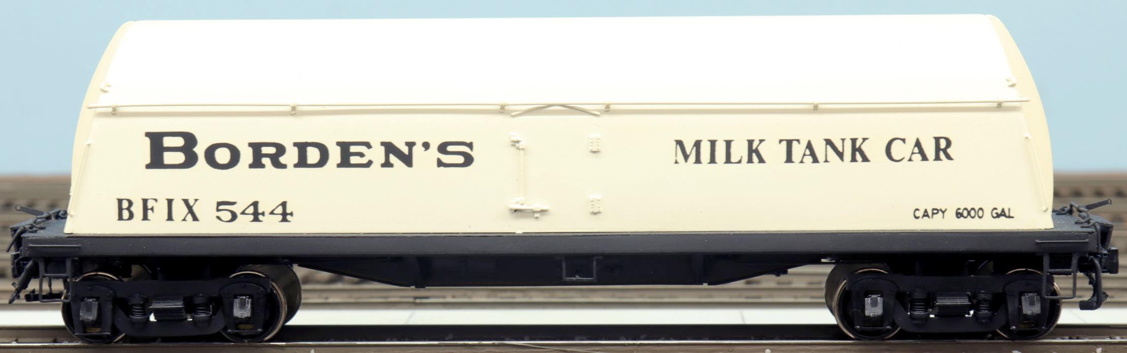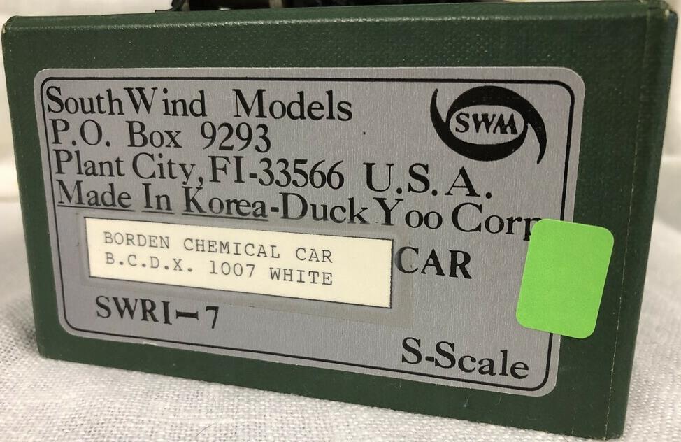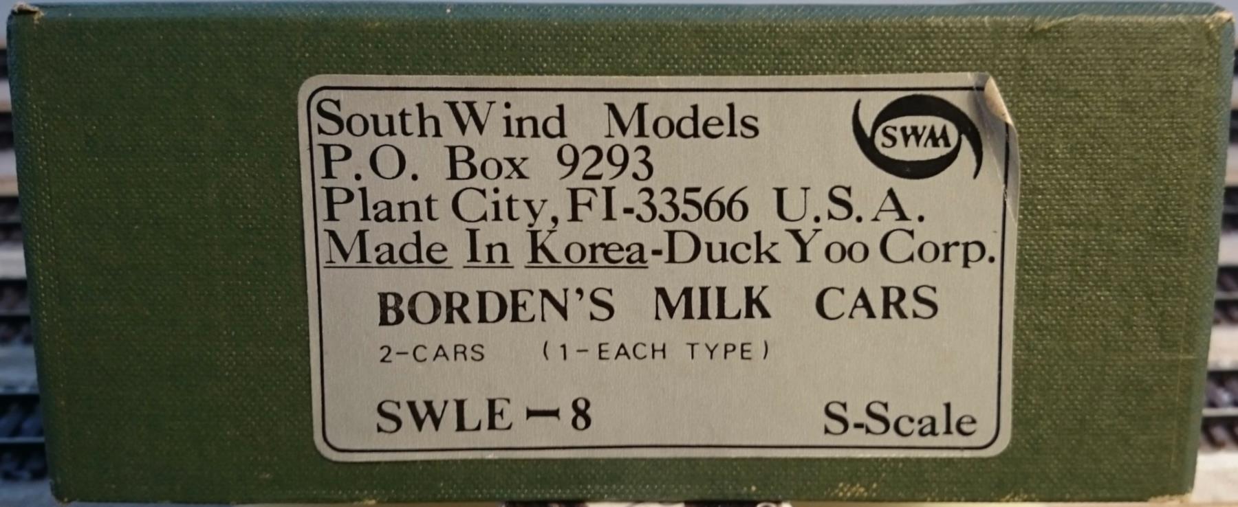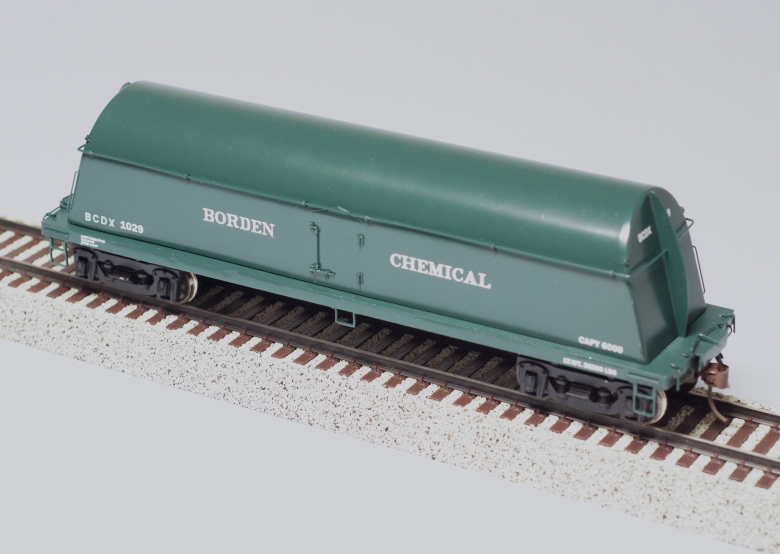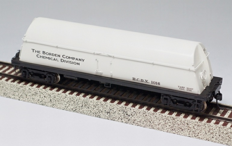This is essentially a flat car with a removable shroud that protects two glass-lined tanks. This model represents the later version that had fins only on the ends of the shroud. This version's brake wheel is attached to the shroud. The SouthWind models arrived unpainted with a clear, semi-gloss lacquer applied. The shroud is attached with four screws from below. At the time these cars came out, River Raisin Models had appropriate decals available for the three known prototype lettering schemes. The model IDs are as follows: