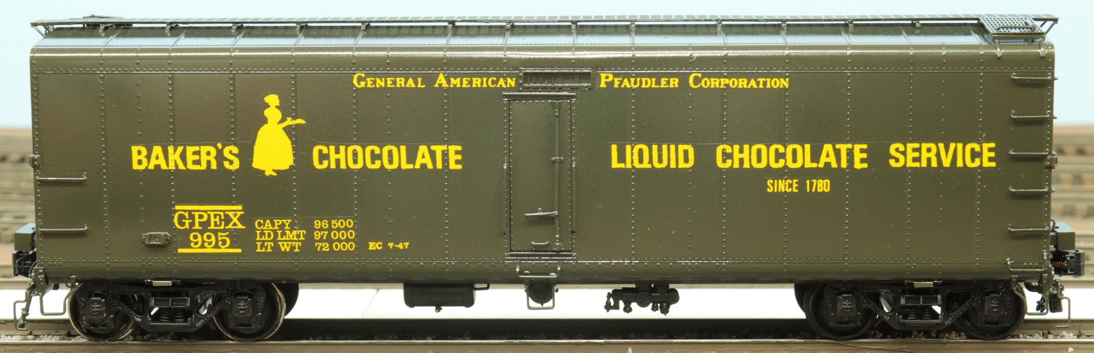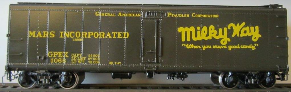 This is a dedicated express milk, run in passenger trains. These models were imported by Overland Models for River Raisin Models. The models were factory-painted green. The box included ten private road name decals. The small loading doors are sprung. The model included the correct Barber S-1-L-P high-speed trucks. One additional model was imported that was unpainted. In the real world, these cars contained two insulated tanks inside, much like the Linde gas tanks inside a standard box car.