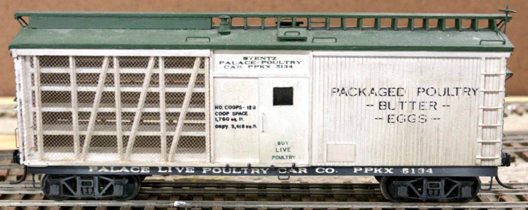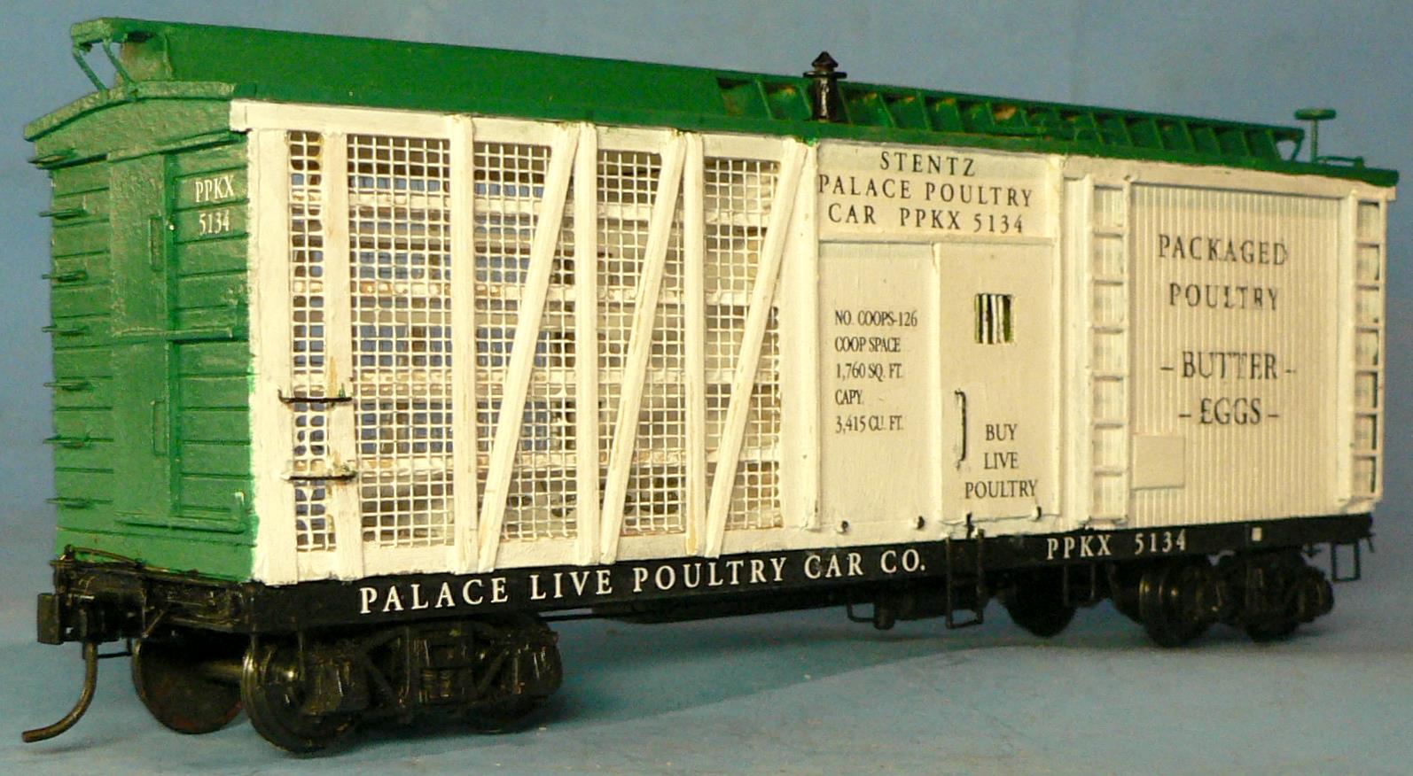 These cars were used to transport live poultry (chickens, turkeys, pigeons, etc.). Half of the car, the caged area, was used for holding the live animals, and the other half is refrigerated for packaged items, such as eggs, butter, and slaughtered poultry. There was also space for the attendant who took care of the animals en route.