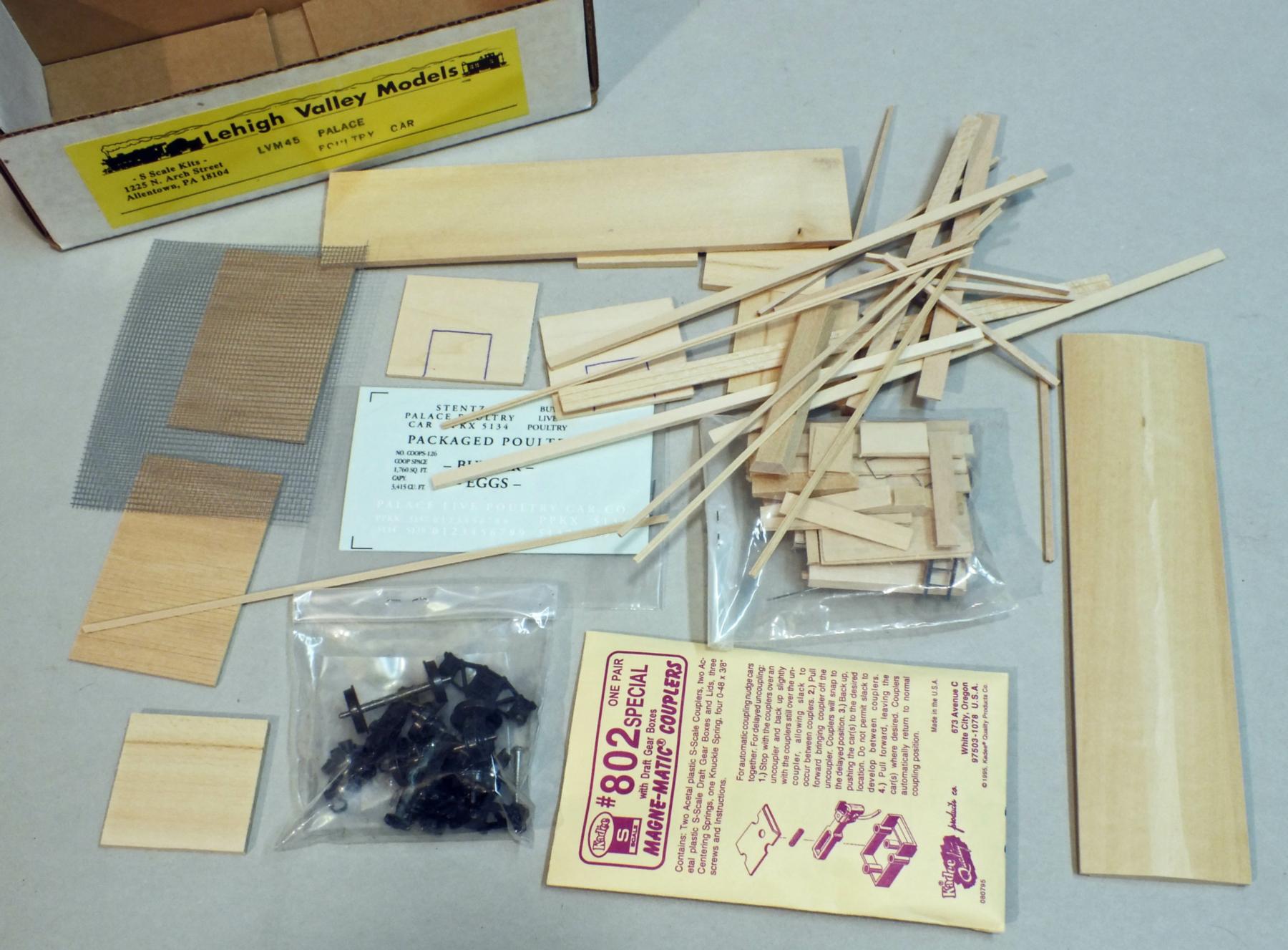 This is a craftsman-style kit consisting of pre-cut wood pieces, Kadee 802 couplers, Ace archbar trucks (kit), KC brake system white metal parts, formed grab irons, brass wire, and custom-printed decals. The PDF version of the May 2017 issue of the Dispatch (pages 38-40) shows more photos of the kit under construction.